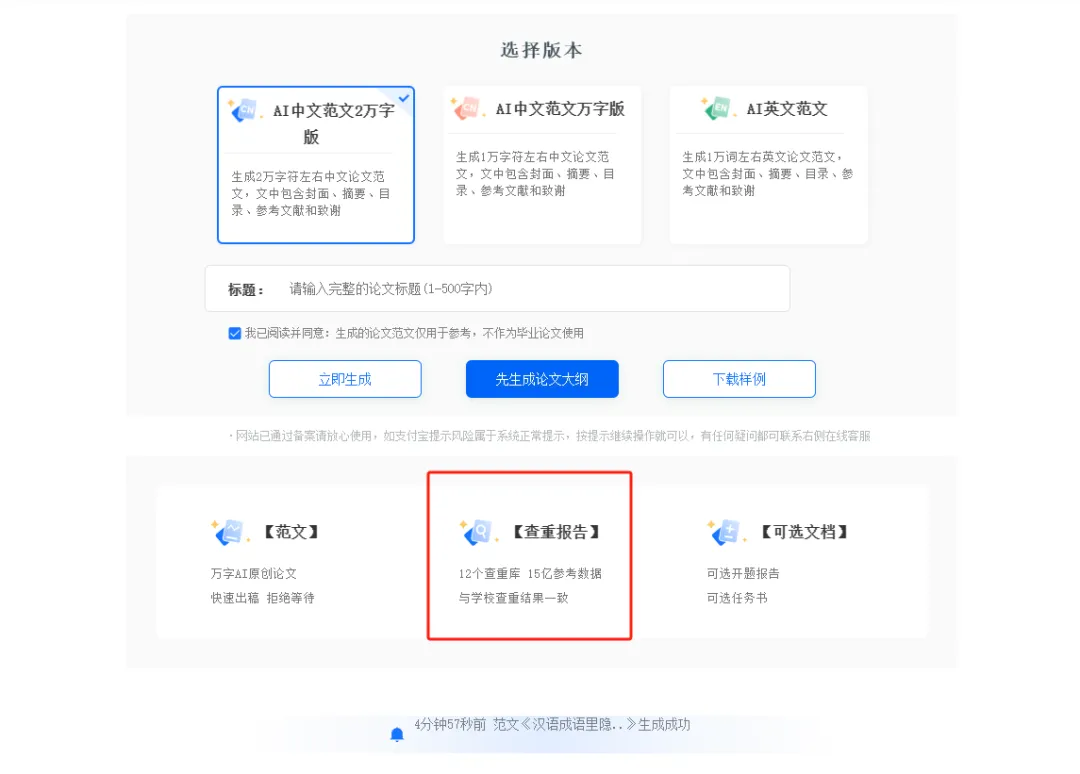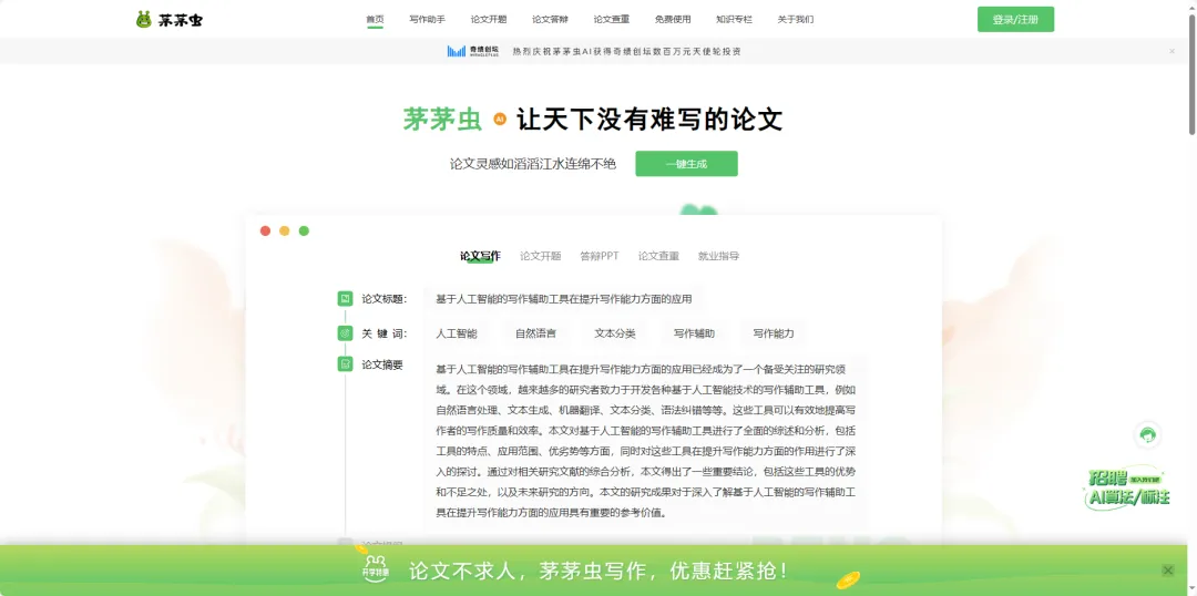 4、性价比最高相比于下面推荐的几个工具,笔灵 AI 论文是性价比最高的那一个。我知道大家是“贫苦大学生”,所以更推荐biling啦。79元能生成三次任意万字论文,大纲还免费生成,很划算。二、aipaperpass✅传送门:https://www.aipaperpass.com/和笔灵相似,它也是一个支持一键生成论文的平台,能帮助用户生成论文大纲、完整论文和参考文献,以及支持论文的格式调整和内容编辑。亮点如下:1、论文大纲生成你可以根据论文题目和所需的字数(专科/本科、研究生、在职、期刊论文)来生成论文三级大纲,这样就可以迅速获得论文思路框架啦。2、写作辅助它提供了40篇知网/中科院真实参考文献,帮助用户构建文献综述和中英文摘要。还有5篇致谢模板和30页答辩PPT框架,以支持论文的完整写作流程。3、用户自定义你可以上传txt参考文档,平台会根据上传的内容“投喂AI”以生成相关内容。三、AICheck✅传送门:https://www.aicheck.cc/AICheck 是一个提供一键生成论文范文的在线服务平台。你可以通过输入论文题目,快速生成包含各种论文组成部分的范文,关键还有附赠查重报告这个亮点。1、论文范文生成输入论文题目,即可一键生成万字论文范文。范文包括封面、摘要、目录、参考文献和致谢等部分。不过AICheck的性价比较低,完整的万字论文生成要149元,推荐给预算较高的同学哈。2、个性化服务除了完整的论文生成,AICheck还提供答辩PPT内容、论文致谢、论文摘要、论文提纲等单个的写作模板来生成相关内容。3、附赠查重报告用户生成范文后可获得一份查重报告,听说它有12个查重库,15亿参考数据,能与学校查重结果一致。四、万能小in✅传送门:https://xiaoin.com.cn/万能小in是面向大学生和泛职场用户的超级AI助手。由一系列不同角色的人工智能对话和聊天助手组成,覆盖学习、工作、生活等全场景,主打一键创作能力。能生成的文档包括专业论文、PPT、演讲稿等。1、创作服务专业论文:支持创作长达2万字的论文,内容包含文献。PPT制作:一键快速生成PPT,简化制作流程。演讲稿:提供各类用途和风格的演讲稿快速生成服务。2、聊天服务目前已经覆盖了学习学术、社交情感、职场办公、文案写作、专家咨询、趣味生活、名人聊天等主流场景。3、私有知识库它可以制作属于你的私人定制AI,也就是根据个人不同层面的需求打造出满足特定用户、特定场景的AI助手。五、茅茅虫论文写作助手✅传送门:https://www.mymmc.cn/茅茅虫写作助手能帮助用户解决学术写作中的各种问题。它通过写作助手、论文查重、论文降重和论文答辩等服务。等功能,极大地提高了写作效率和质量。1、论文灵感海量学术数据:提供两亿文献的海量数据,丰富的文献类型和元数据总库,以及多字段检索方式,确保学术数据的多样性。智能搜集与分类:系统能够高效地搜集和分类相关文献,为你推荐个性化的提纲。2、写作辅助提供在线论文写作功能,支持片段对照和随时编辑。3、精准查重技术采用精准分段查重技术,确保查重的准确性和价格的优惠。总的来说,AI论文写作工具强大又实用,它们为我们的学术研究和论文写作带来了前所未有的便利。只要我们明智地使用它们,充分发挥其优势,同时保持我们的独立思考和创新能力,就一定能够快速高效地充分提升论文质量!