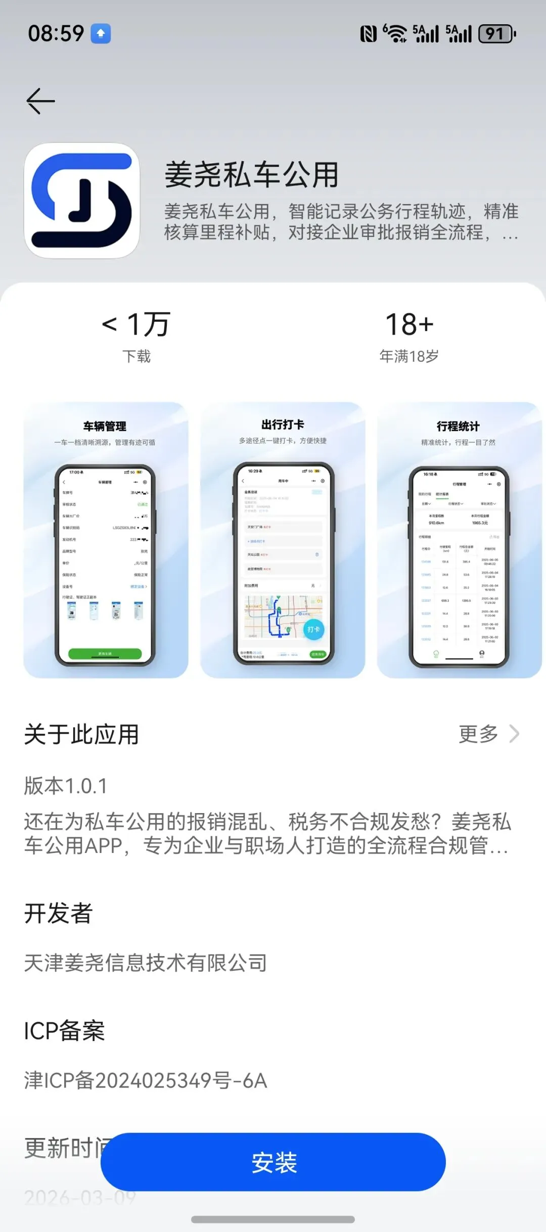 现在,打开华为应用市场、小米应用商店、vivo 应用商店、OPPO 软件商店等各主流安卓应用市场,搜索 “姜尧私车公用”,即可一键下载安装,让企业出行管理更合规,让员工报销更省心!