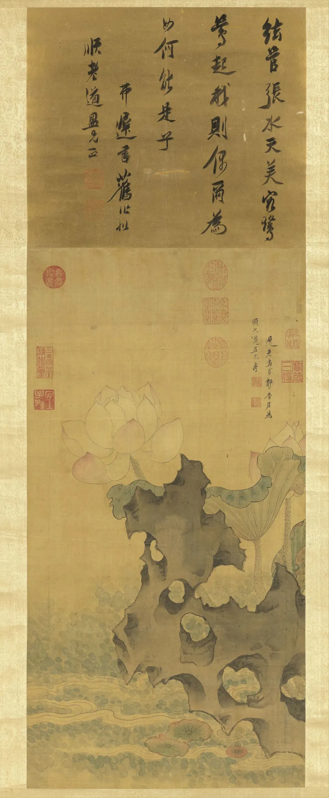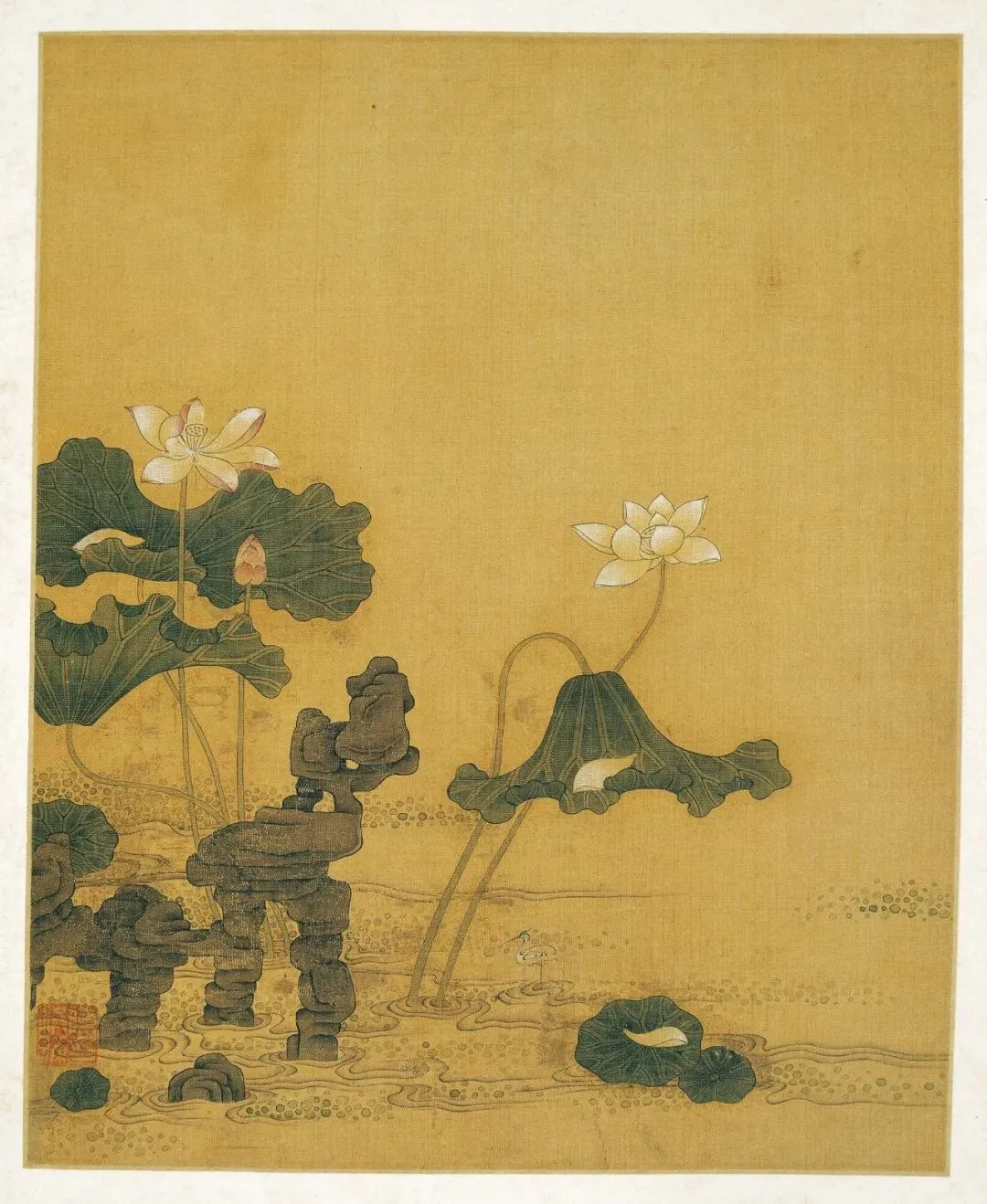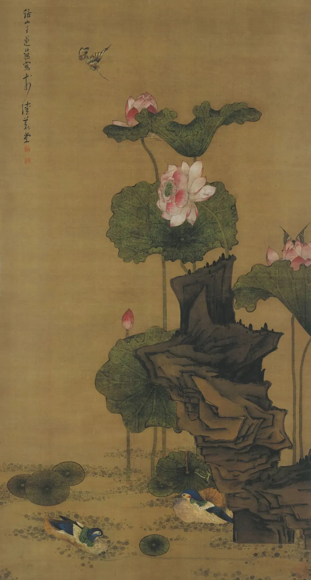《荷花鸳鸯图》以“出淤泥而不染,濯清涟而不妖”的荷花为题,花朵清丽,或含苞,初绽、或怒放,多姿多态;枝叶带露,娉婷舒展,俯仰欹侧;湖石雄奇,锐利坚崚,厚重沉凝。