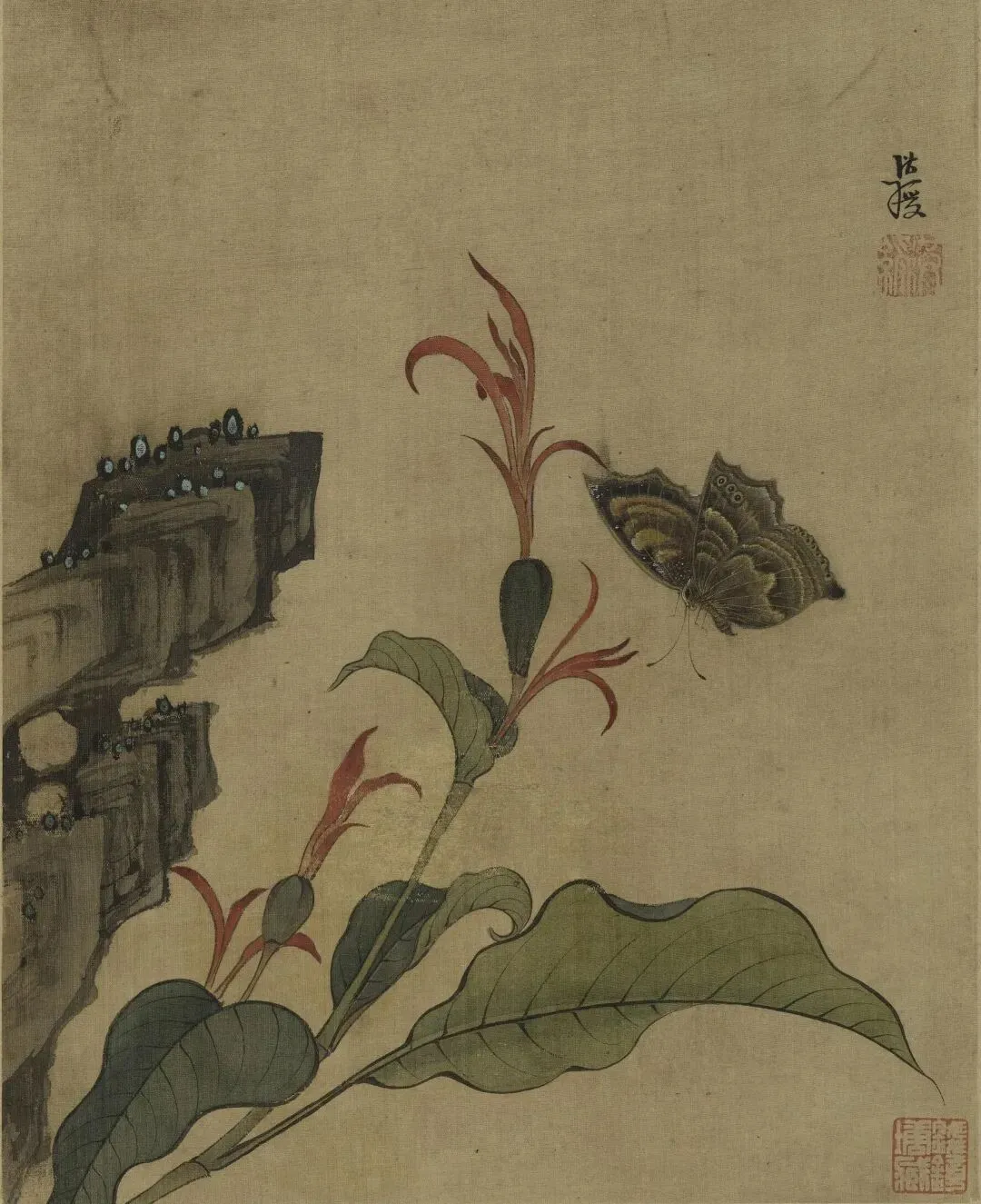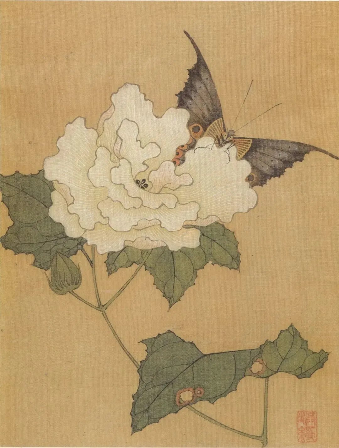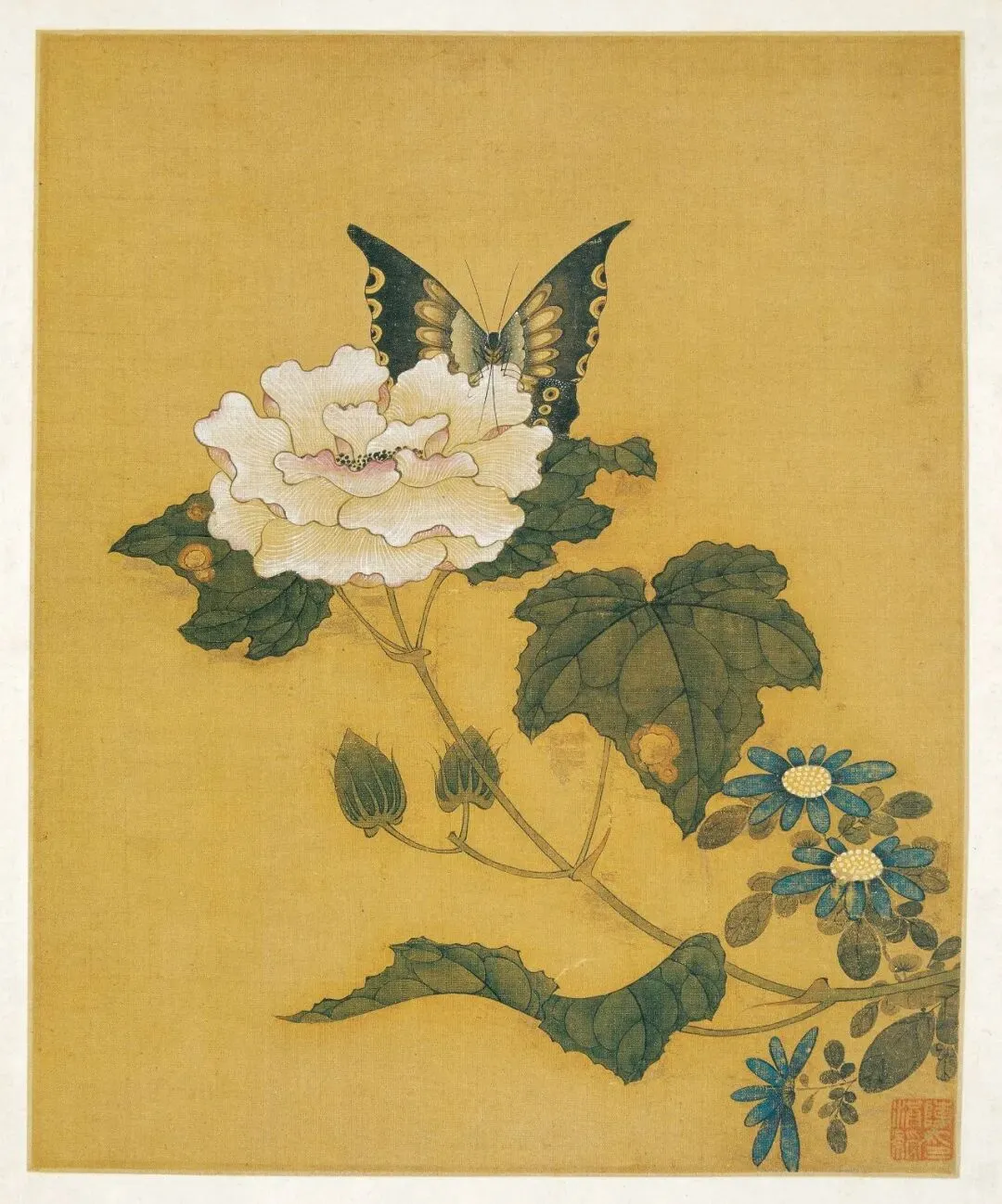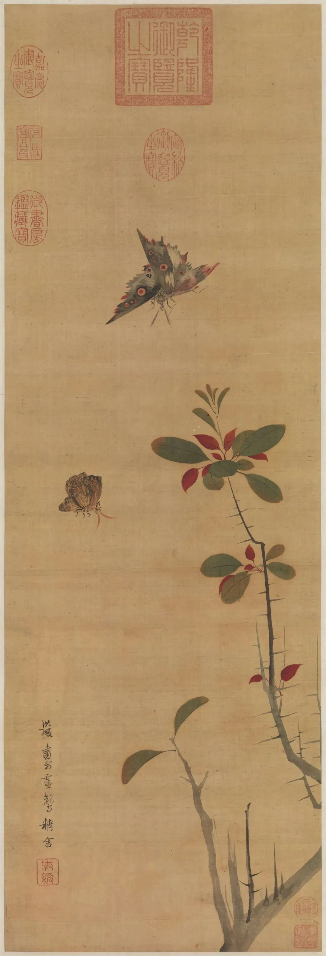 《花蝶写生图》绘荆棘一株,上面生长着两种颜色的叶片,红、绿交相映照,表现出欣欣向荣的盎然生意。两只造型各异的蝴蝶,上下鼓动着双翼,与荆枝形成了绝妙的呼应效果,尽管构图简洁,却是画家的精心杰作。
