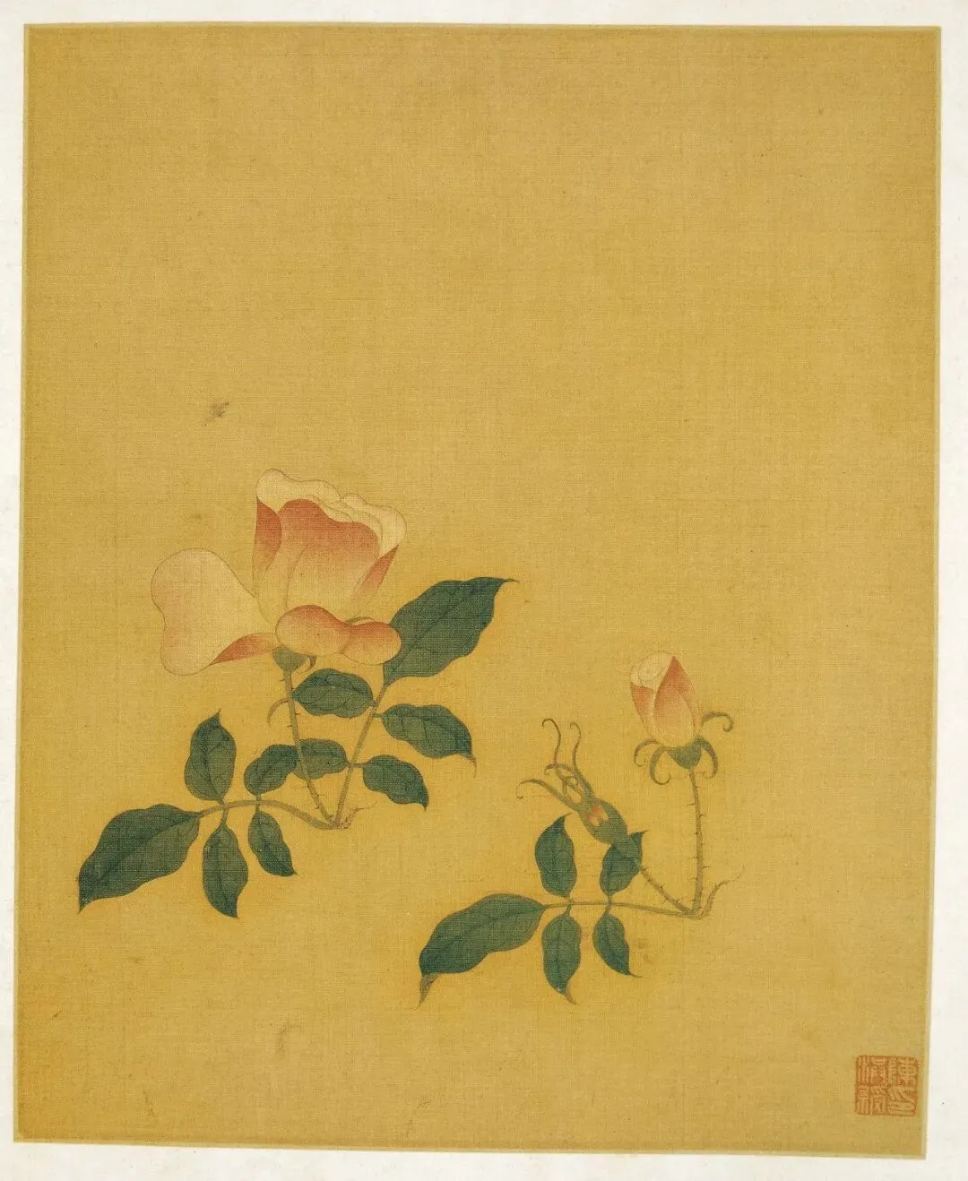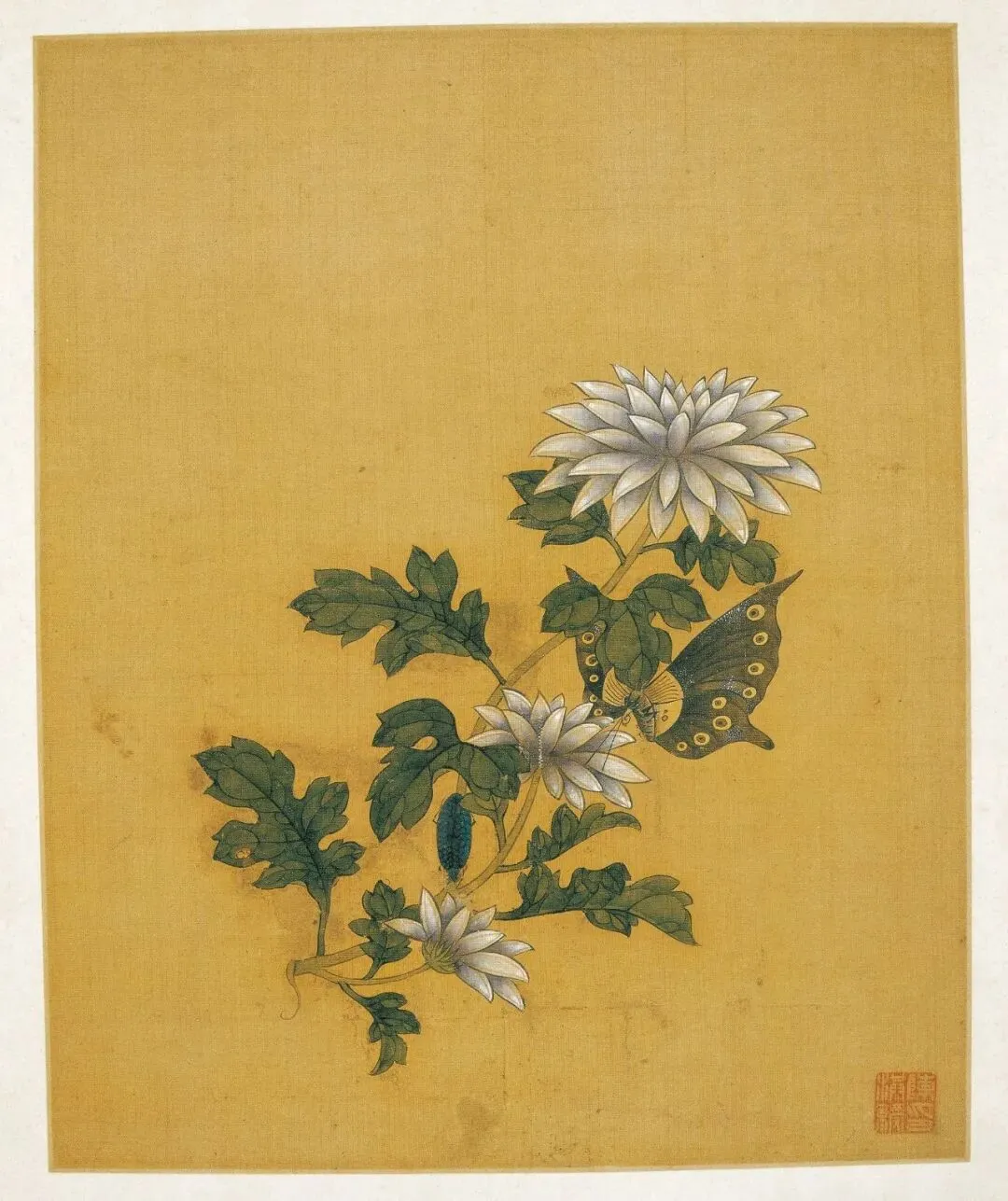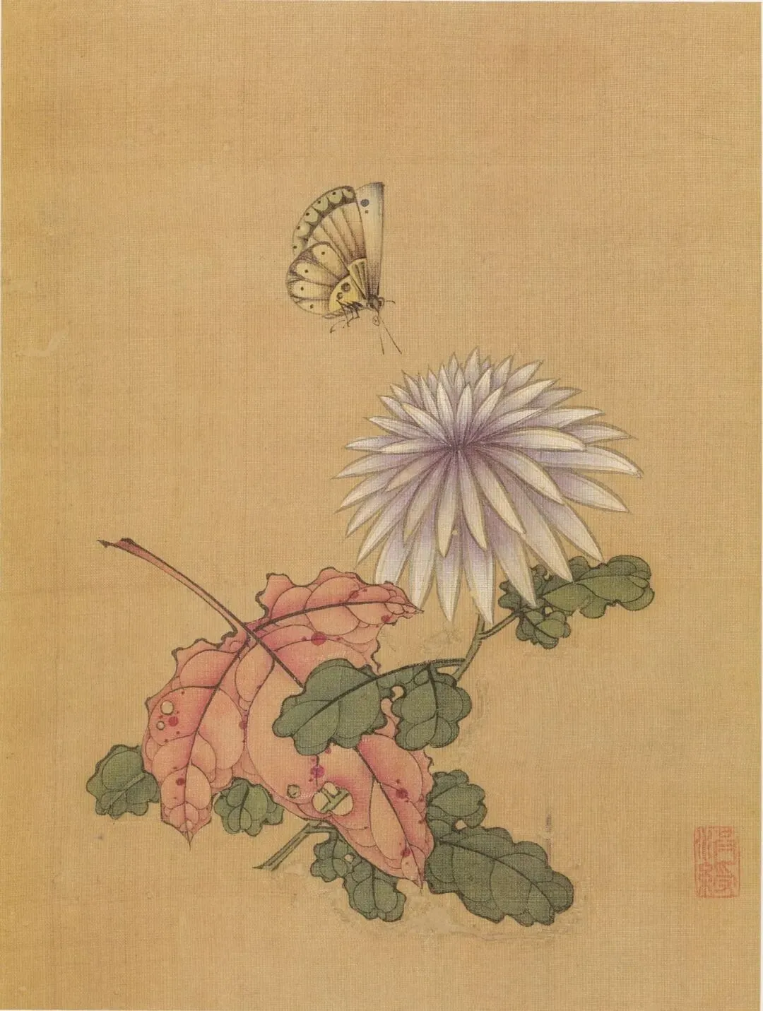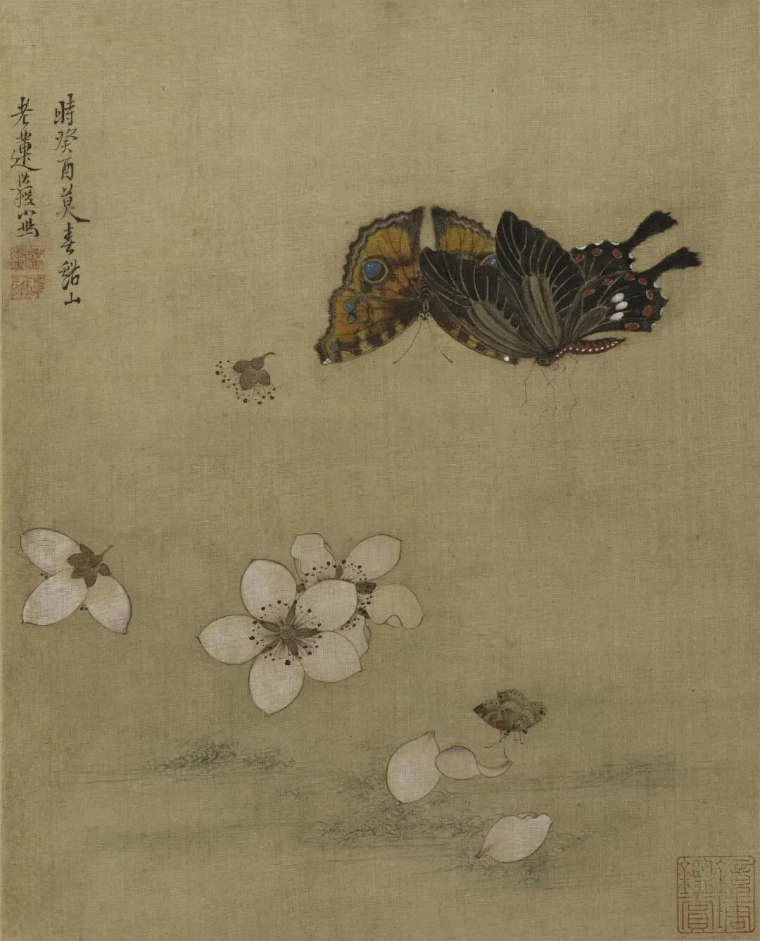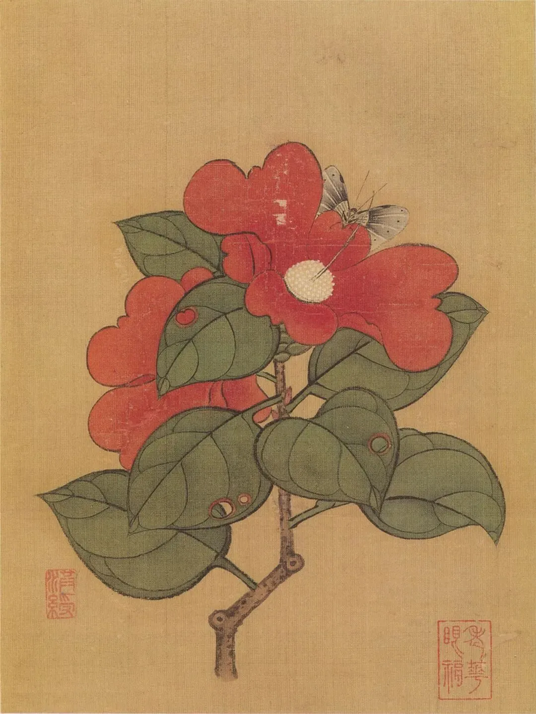《花蝶写生图》绘荆棘一株,上面生长着两种颜色的叶片,红、绿交相映照,表现出欣欣向荣的盎然生意。两只造型各异的蝴蝶,上下鼓动着双翼,与荆枝形成了绝妙的呼应效果,尽管构图简洁,却是画家的精心杰作。