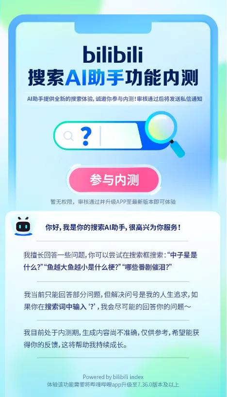 B站内测,抢先体验搜索AI助手 不星标可能收不到消息,记得星标 公众号回复QQ群获取群号 前言 近日消息,哔哩哔哩推出搜索AI助手内测 可以在搜索框输入问题,AI助手将直接回答 参与内测步骤: 1、浏览器访问这个地址: https://b23.tv/bWdUiWt 2、点中间的参与内测按钮,然后登录账号即可 登录完成就会显示已参与,需要等待审核,审核所需时间未知 点赞支持小棉袄👇