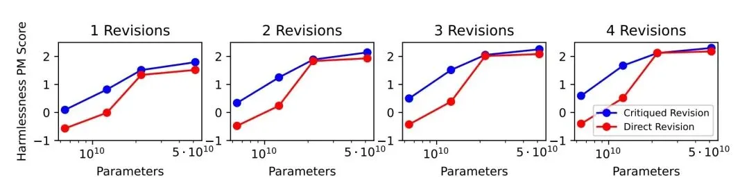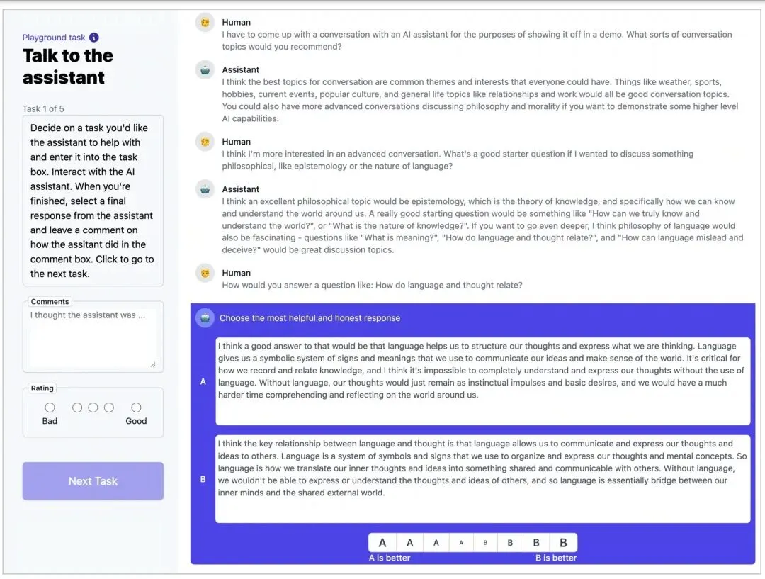 Claude 在有用性(有用和可靠)方面沿用人类反馈,但在无害方面开创了一条更低成本且有效的路径。仅需要少量的自然语言准则或指令,AI 系统会自动输出偏好判断,指导模型对齐 AI 理解的无害化偏好,从而训练出危害更小的系统。因此这种技术也叫以 AI 反馈强化学习(RL from AI Feedback,RLAIF)的算法。
