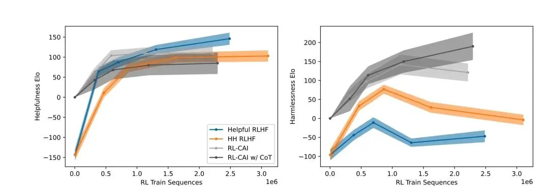 深灰色线(RLAIF w/ CoT):通过 AI 反馈的强化学习 + 思维链(Chain-of-Thought, CoT),有效性略弱,无害性显著强。