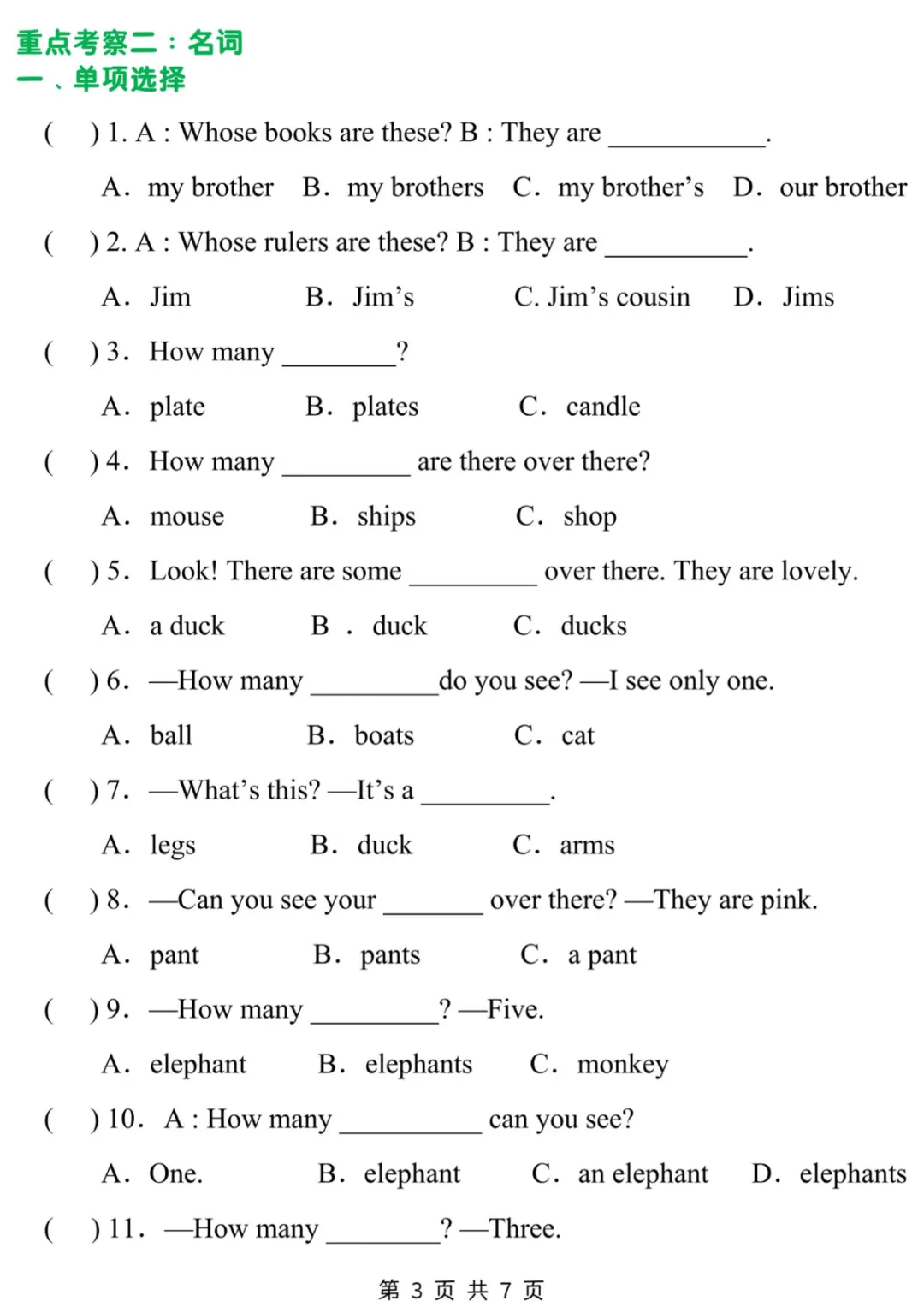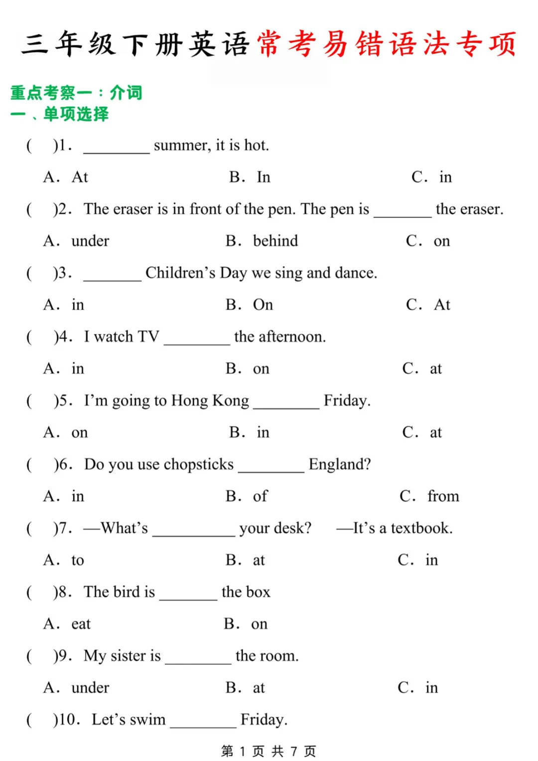 三年级下英语常考易错题