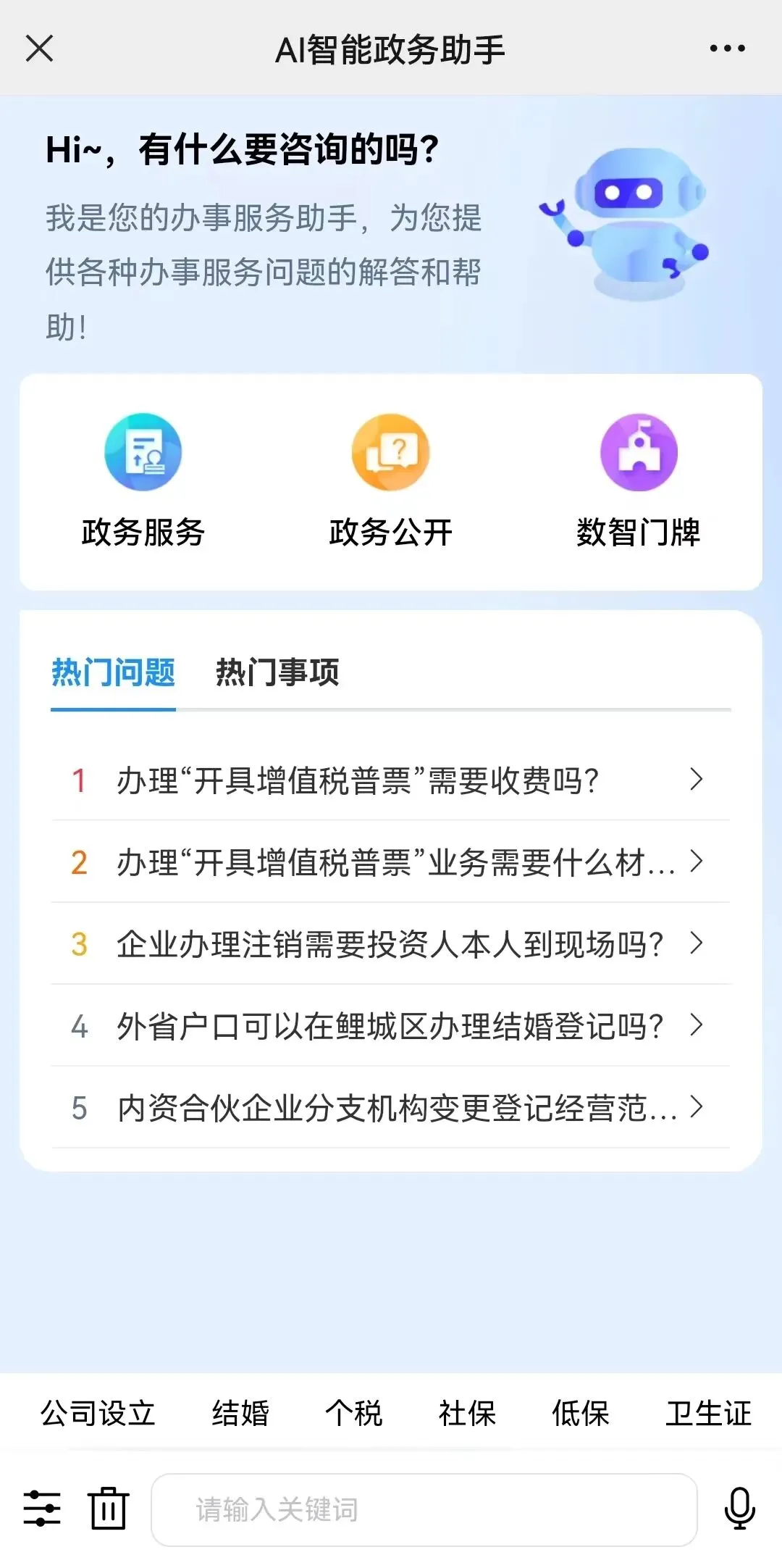 据悉,鲤城区“AI智能政务助手”由区行政服务中心管委会打造,是依托微信公众号“鲤城政务服务”打造的综合性智慧政务服务平台,涵盖政务服务、政务公开以及数智门牌三大板块,集纳一站式服务、智能咨询、办事指南、预约服务等功能,能为市民群众提供24小时在线政务咨询服务,是鲤城区打造“全速办”政务服务品牌的又一创新举措。目前,“AI智能政务助手”已收集近3000项办事服务事项,录入约10万条政务问答知识。