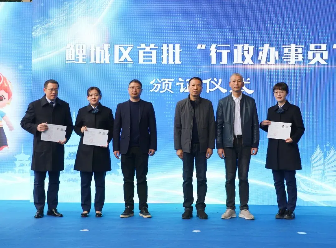 当天,现场还举行鲤城区首批“行政办事员”颁证仪式,与会领导为“行政办事员”代表颁发证书。据悉,为推动鲤城区政务服务水平不断提高,推进窗口工作人员职业化、专业化发展,区政务服务中心组织窗口工作人员参加行政办事员国家职业技能水平考试,首批共有78名“行政办事员”持证上岗。