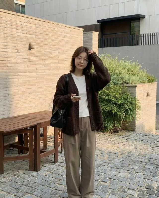当内搭,外面套我那件穿了三年的H型西装。开衫只扣最下面两颗,上面敞开,露出里面的白色针织背心(39元优衣库基础款)。西装一罩,只露出开衫的V领边缘和一点绞花纹理,膨胀感瞬间消失,反而有了层次。上周见客户就这么穿的,对方还夸我“今天搭配有点小心思”。