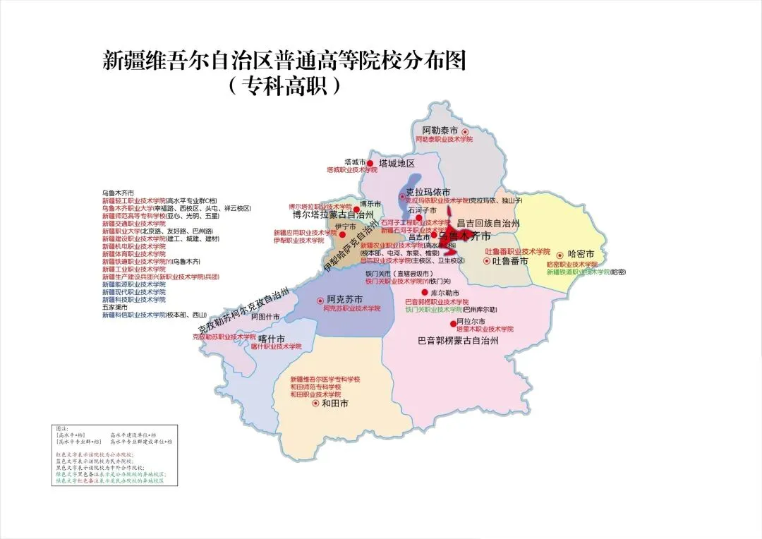 注:新疆高职院校地理位置分布图为往年数据,仅供参考,对新疆各市地理位置有个清醒的认识。