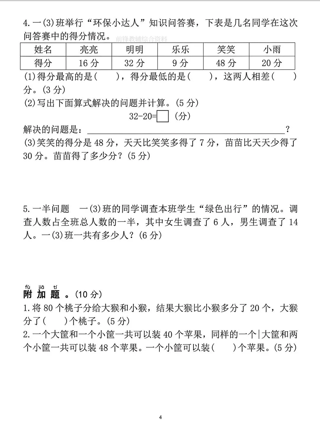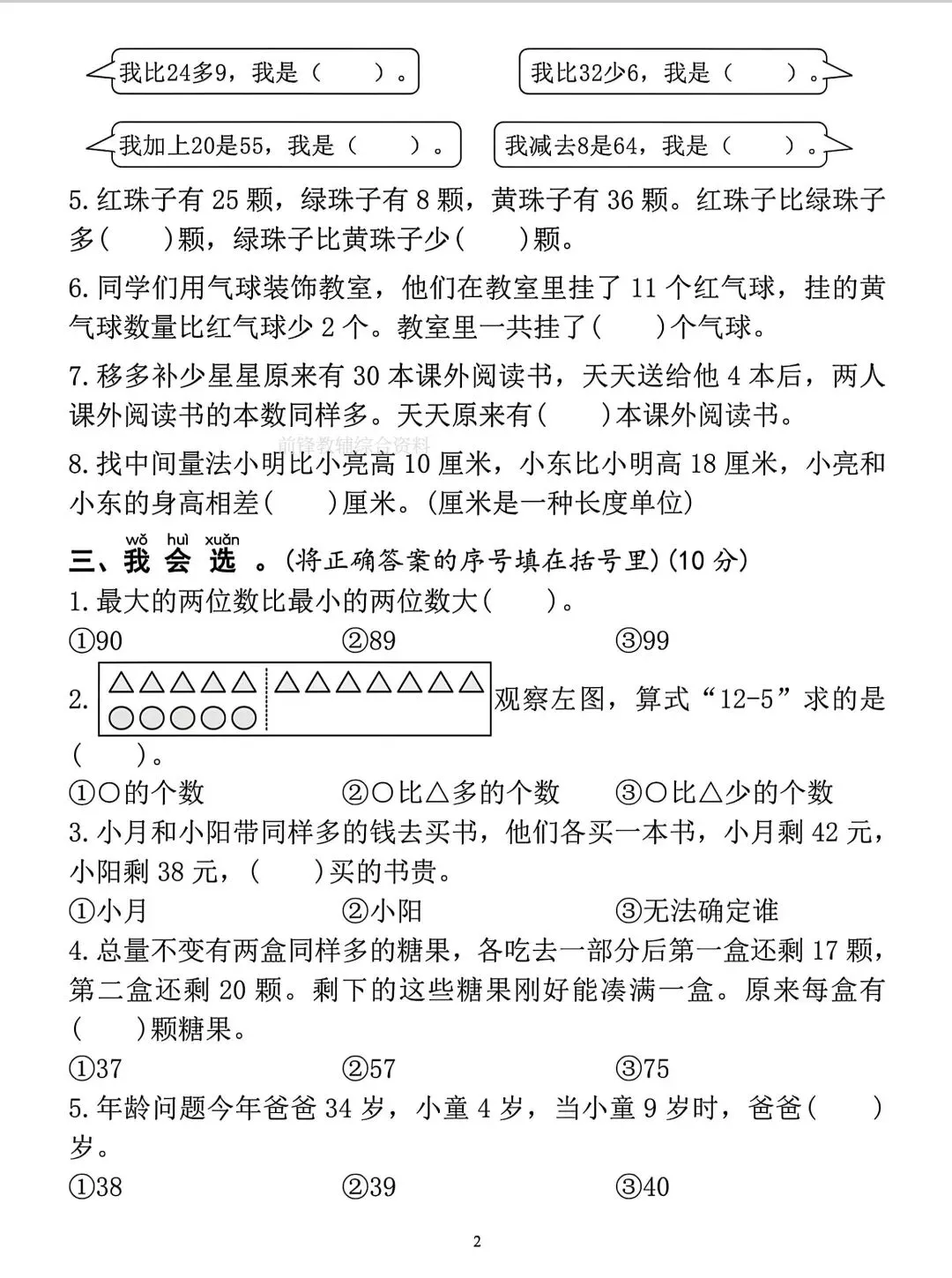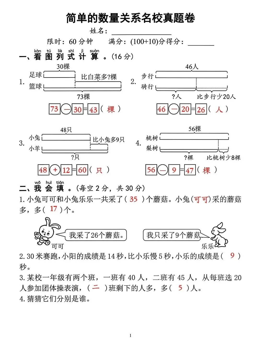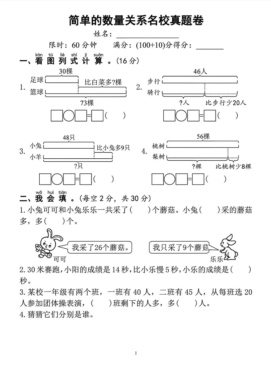 一年级下册数学简单数量关系名校真题卷电子版可打印