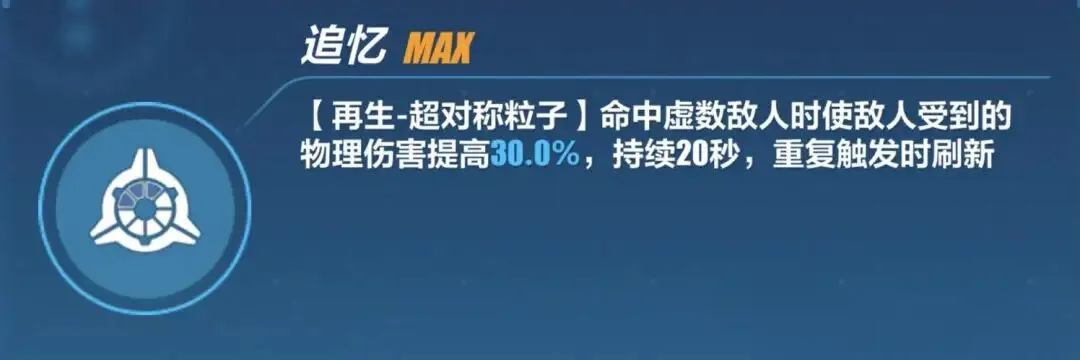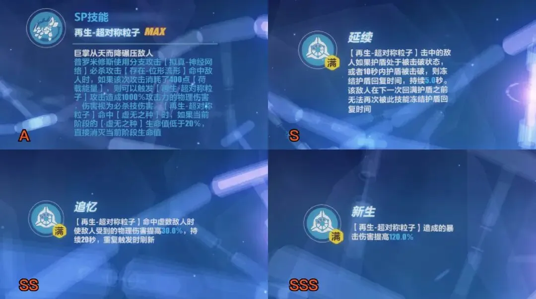 此外,若一次性消耗400点动能,则进一步触发特殊技能「再生-超对称粒子」,造成高倍率的物理伤害(视为必杀技伤害)。