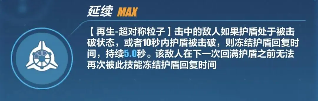 4)若敌人护盾被击破或护盾处于被击破状态,则冻结敌人护盾回复时间,是实现二次冻结敌人护盾的关键技能(SS解锁)。