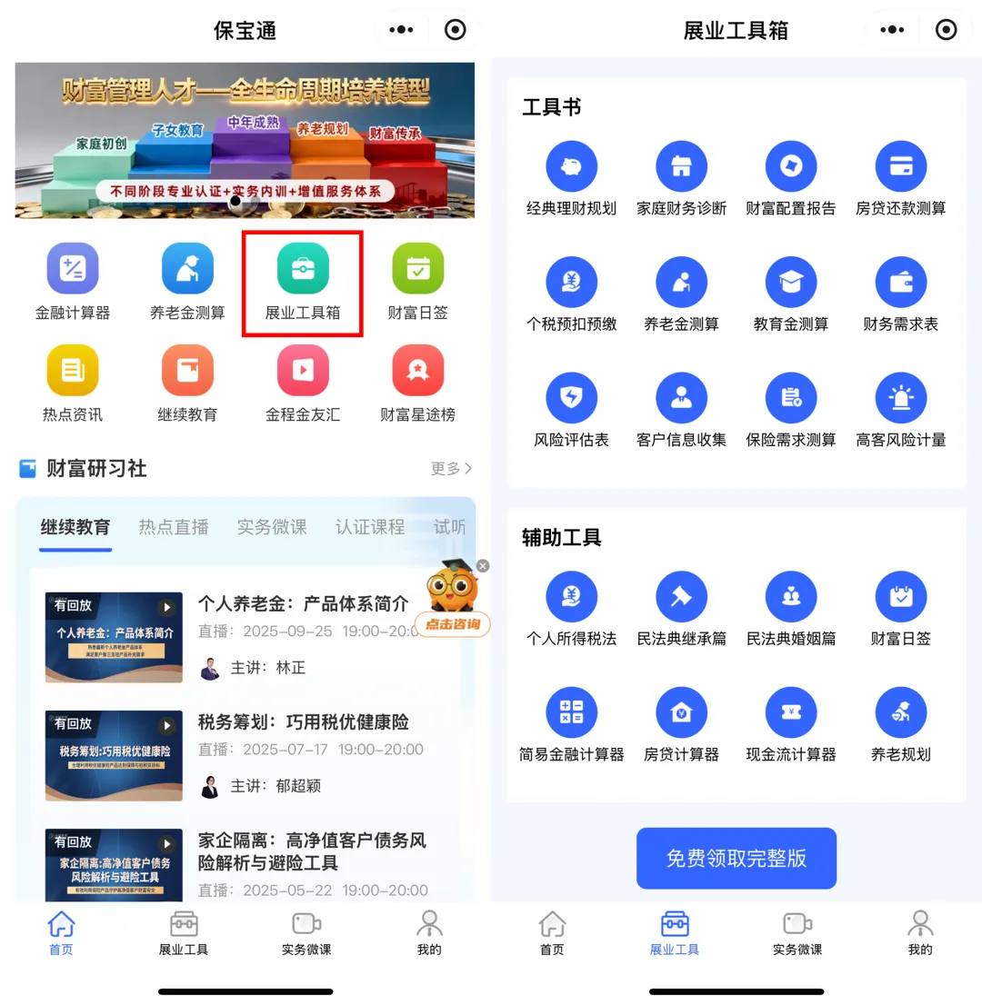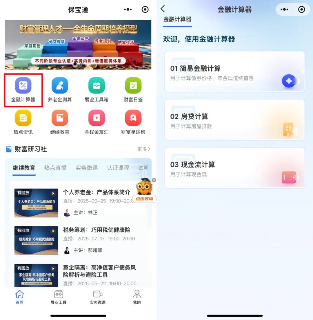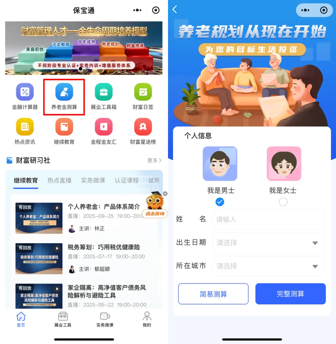 测算类: “教育金测算”、“保险需求测算”等,精准量化客户人生各阶段的风险与需求。