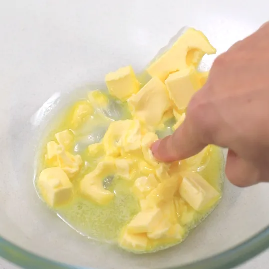 50g黄油提前软化,我是用微波炉叮了30秒的,所以部分有点点液化,但只要是用手指可以轻松戳穿的程度就刚好,你也可以放在暖气片上,或者用电吹风等方式软化黄油。