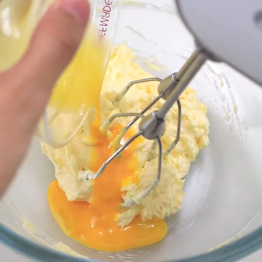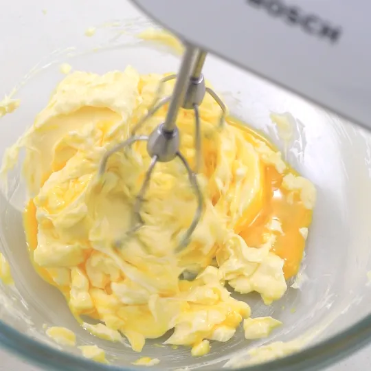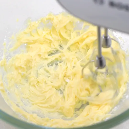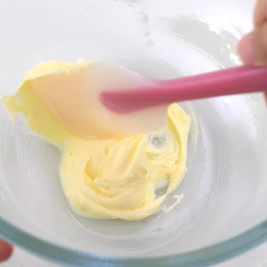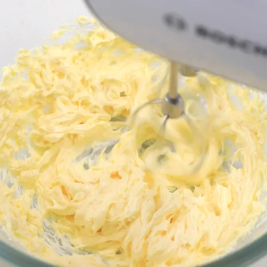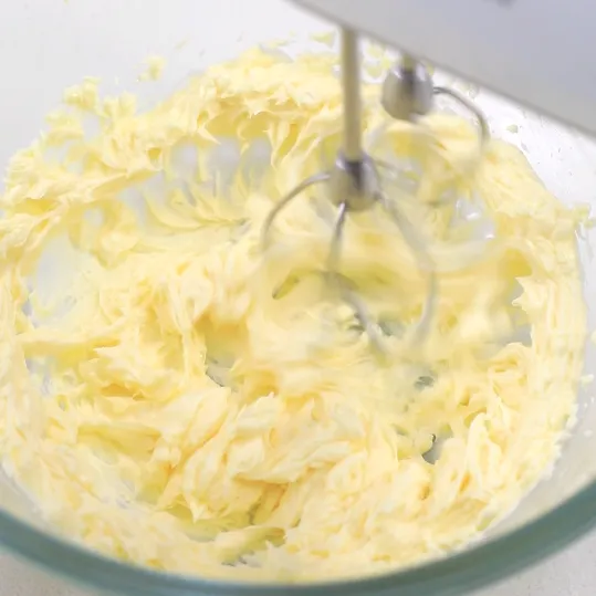 想要把黄油充分打发,除了事前一定要将黄油软化,在打发时,我们还可以将贴在周围的黄油收拢。