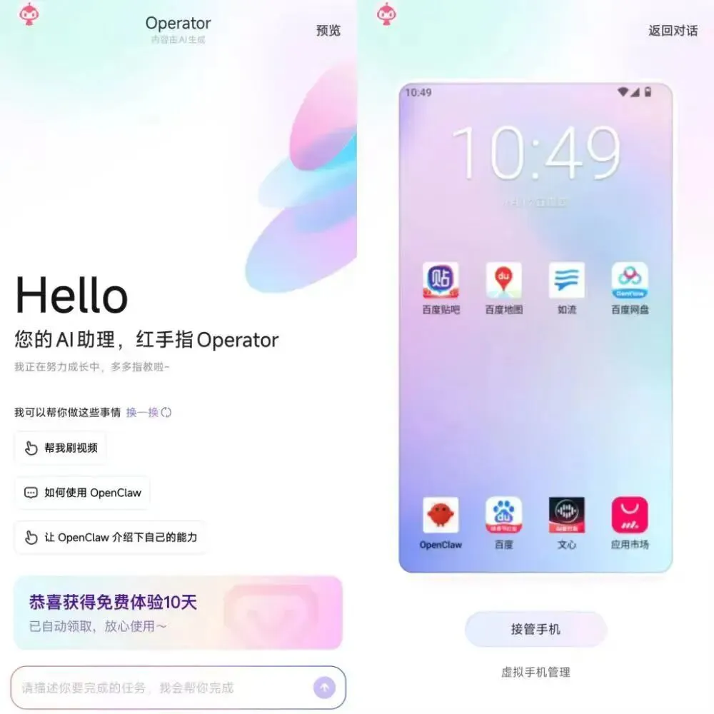市面上更多的🦞龙虾教程是针对电脑端的,截止目前,还没看见第一款支持在手机端的🦞龙虾App。然而,手机养龙虾自由,被百度实现了—『红手指Operator』!