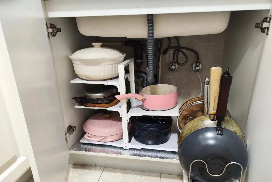 和原来那种传统楼梯式锅架对比,拉篮的高级感不是说出来的。最开始,我犹豫要不要攒钱买那种成品多层挂架,网上有的看起来很强大,但号称“能悬挂一切”,实际上适用场景不多,层距死板不说,炒锅一挂直接磕打掉漆。就因为这个原因,才想着琢磨DIY路线。一左一右搭配——水槽下方左侧是可调节隔板搭成的空间,锅高就调高,锅小就紧贴。右边则是弹出来的抽拉架,垂直挂满五口不占地。最有成就感的不是看着满格的锅具,而是再没遇上锅沿粘锅柄、滑出来摔脚这种窘事。