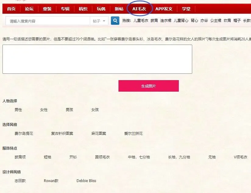 这里可以通过“任务选择”、“选择风格”、“服饰特点”、“设计师风格”这些选项的选择,同时加上自己对需求的描述,生成所需毛衣编织图片
