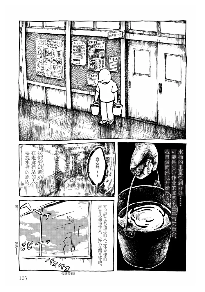 萧勇:我其实是上周才知道这位作者的(笑)。猫咪星老塞给我漫画看,虽然我们私下里经常交流,但这么正式地聊还是头一次。我看的第一篇就是《站立的方法》,讲一个孩子被罚站,提着两桶水,觉得这水的重量正好等于他忘带作业的罪恶感。罚站结束要倒水时又觉得可惜,他就拎去浇花。panpanya是挺环保的一个人,大家看完就会知道,ta用什么都还回去(笑)。这时孩子意识到这等同于自己罪恶的水,对花来说却是生命之源。从这篇开始,我体会到panpanya的作品非常特殊,ta的漫画不是靠情节推进,每个画面每个转折都需要你亲自读才能感受到趣味。