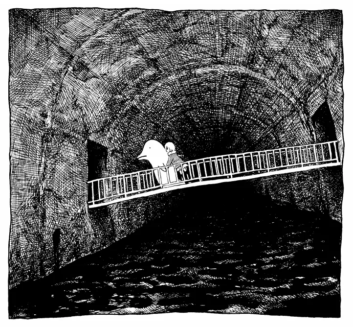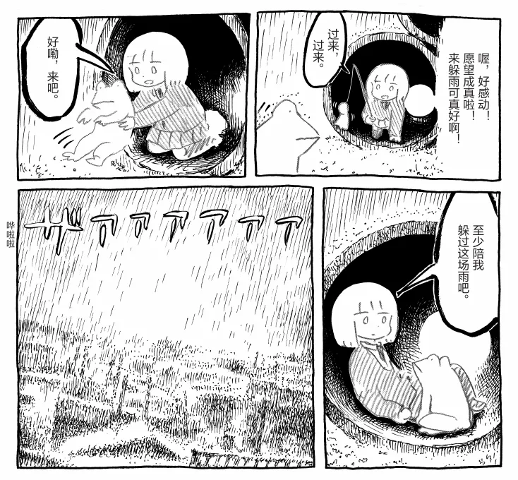 笑笑:panpanya作品呈现的不是单一的感受,像之前提到的《地下巡游》,里面带路的小海豚很可爱,买比萨包子的目的也可爱,主人公还留着波波头,但整个氛围却是阴森的。我还喜欢《雨天》这个短篇,小女孩在水泥管中躲雨时看到外面有一只青蛙,于是她直接把青蛙抱进来,像抱小猫咪。