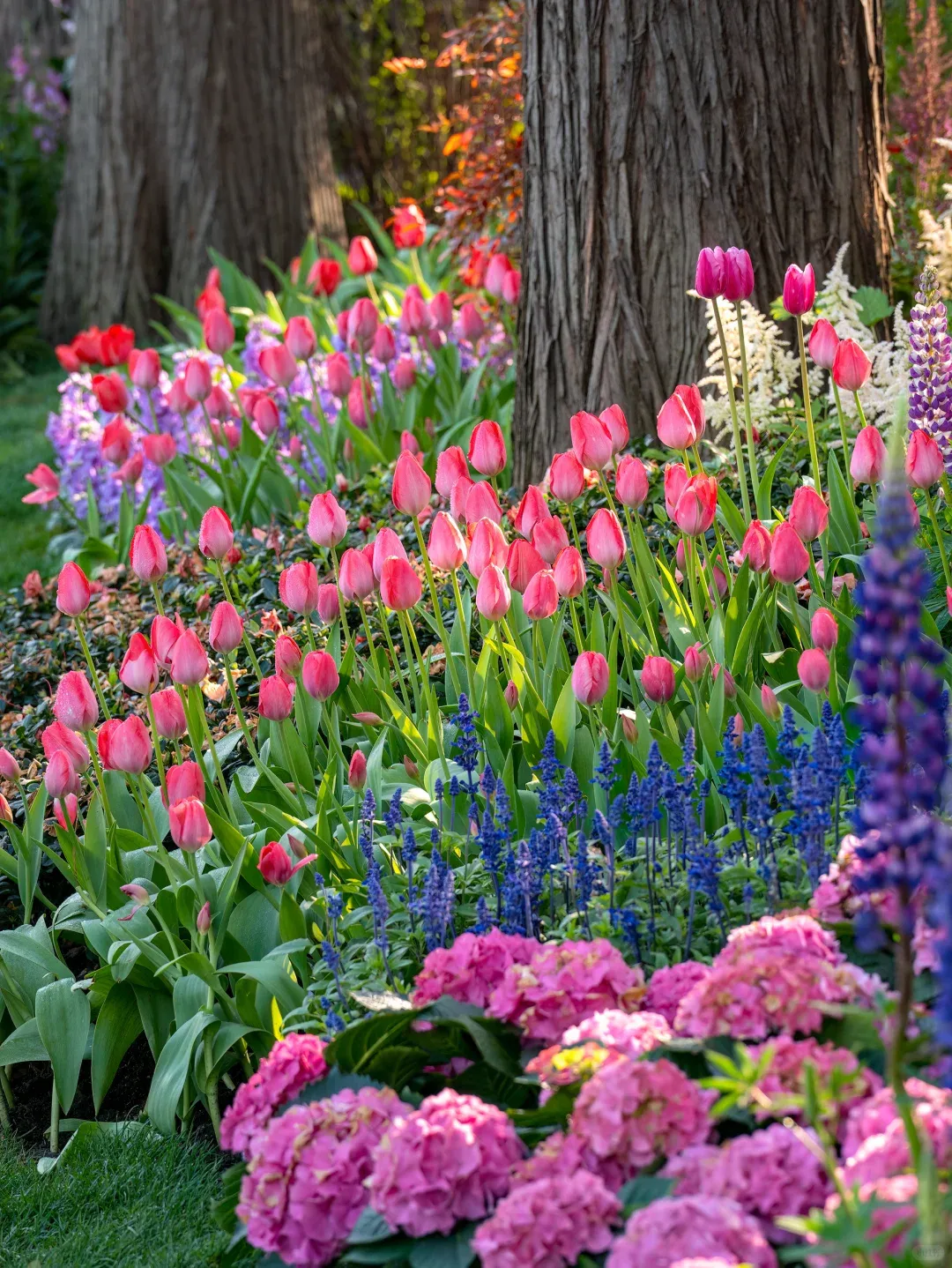 太子湾的樱花和郁金香混种在一起,层层叠叠。走在草坡上,远处是西湖山影,近处是大片花海——画面感太强。