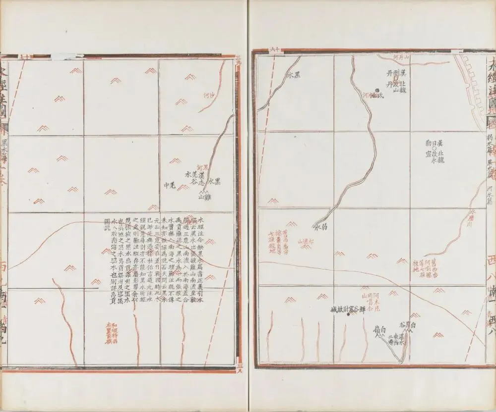 《水经注图》全书八册,共四十卷,附二十七水补图,绘图三百余幅,采用 “古墨今朱” 双层套印,是中国首部系统配套《水经注》的历史地理图集。核心遵循 “古今对照、水道为纲” 原则,以《大清一统舆图》为现代地理底图,黑色标注古代水系、城邑、山川,红色标注清代现行水系与政区,直观呈现古今地理变迁。