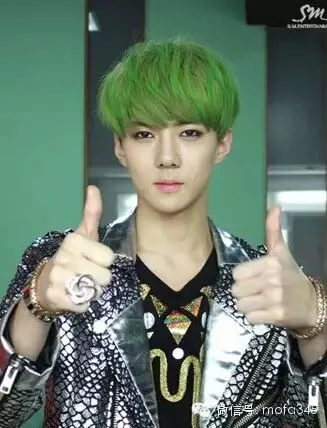 男生鹦鹉绿染发:艾薇儿的鹦鹉绿染发发型让人惊艳,令无数观众至今都无法忘记艾薇儿的这款造型。吴世勋效仿艾薇儿,给自己的头发染上了鹦鹉绿发色,于是吴世勋的发型一下就变得时尚前卫了。可是,不知道吴世勋的这款韩版男士发型,是不是大家喜欢的款呢?