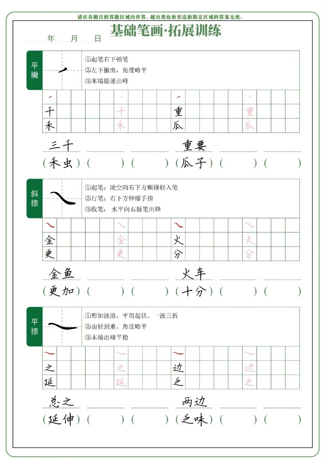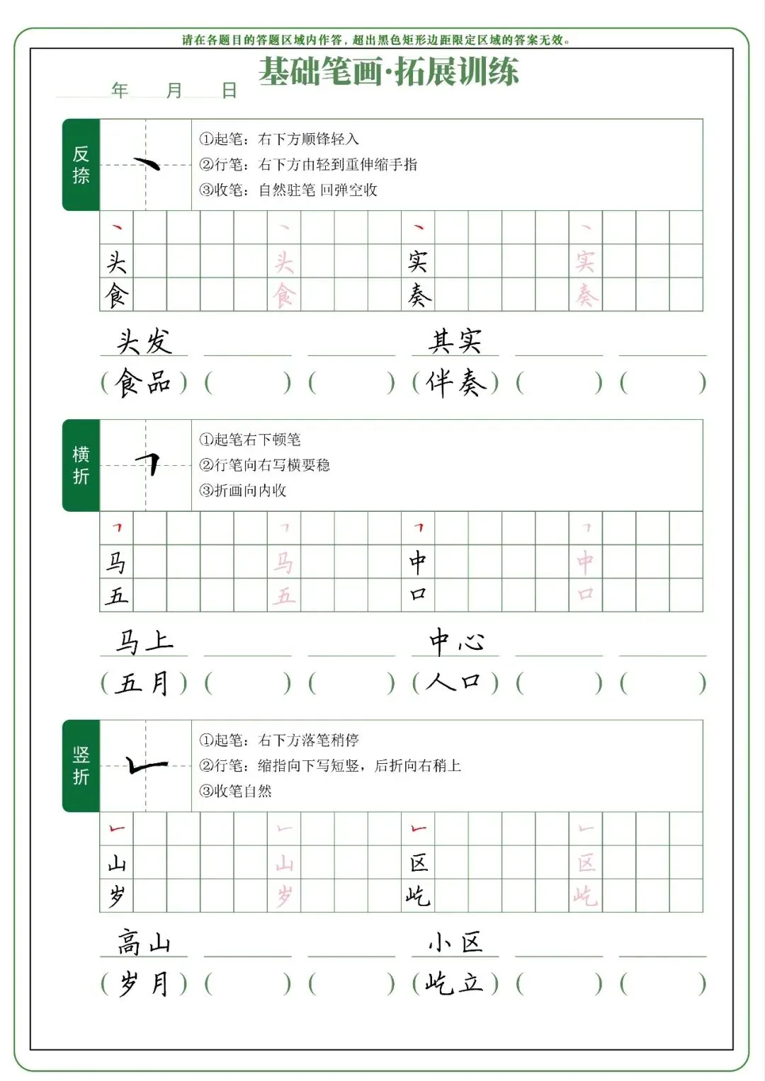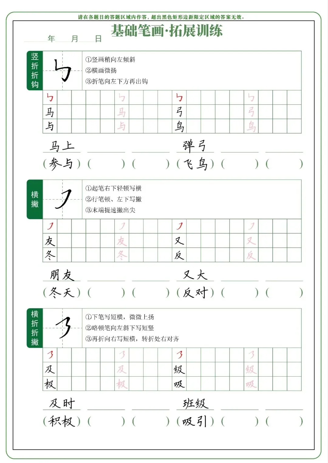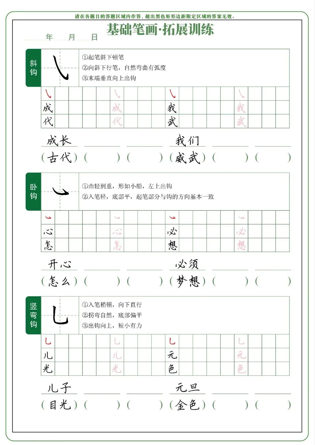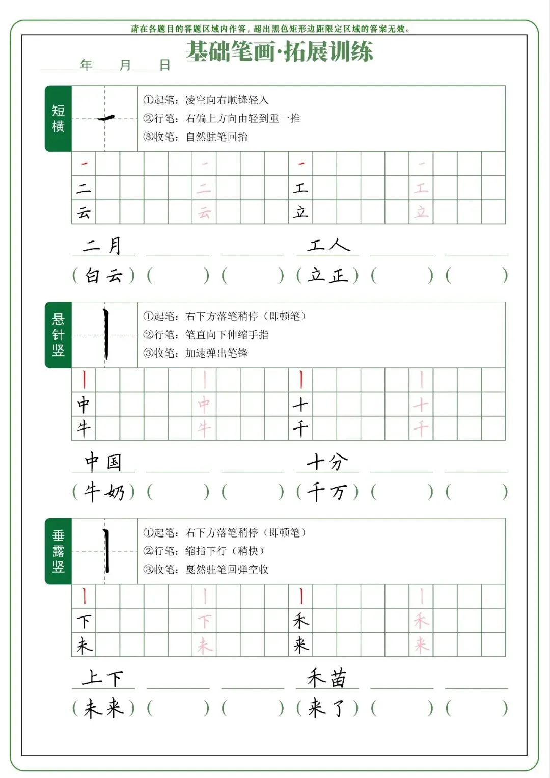 横平竖直略上扬,撇捺干脆不夸张。点钩短小要利落,不描不连卷面强。