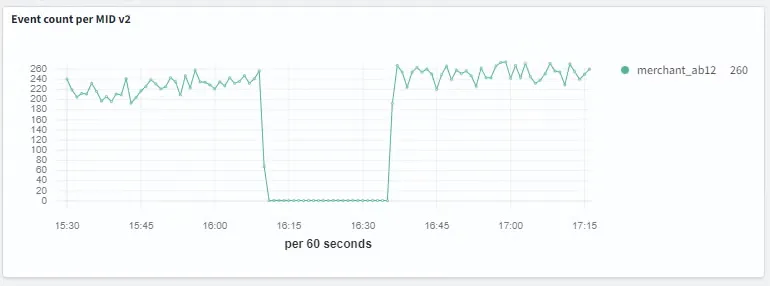 为了进一步调查,Klarna 团队搭建了一个类似生产环境的测试环境,在该环境中生成合成事件,并实时导入 OpenSearch 集群。在下例中,图表显示了其中一个受监控实体(标识为 merchant_ab12)的事件计数。在测试期间,他们暂时停用了该实体的事件生成,导致事件计数出现了持续约 30 分钟的明显下降,如下图所示。