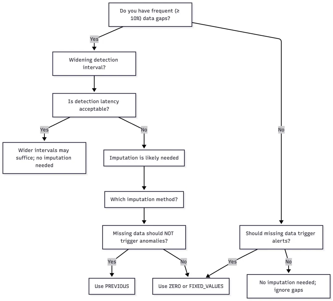 Klarna 的经验提出了异常检测中的一个关键问题:如何处理缺失数据?首先且最简单的策略通常是放宽检测器间隔。在许多监控设置中,稍微延长间隔是减少空数据桶数量的最直接方法。然而,对于实时用例来说,过长的间隔会导致检测过于滞后。当放宽间隔不可行时,插补是首选解决方案,但必须谨慎处理——在长间隙上进行插补可能会引入过时且不具代表性的信息。