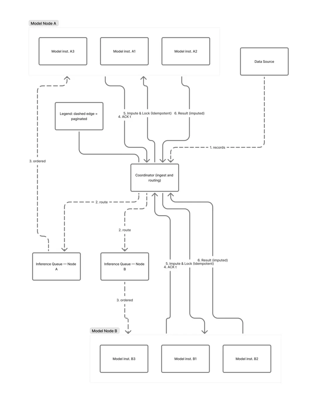 2. 同步与插补:协调节点等待来自所有模型节点的确认(ACK),确认它们已处理了间隔t 的真实数据。此 ACK 屏障确保不会过早进行插补。一旦同步,协调节点会发送一条控制消息以触发任何静默序列的插补阶段。