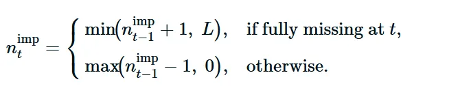 对于用户可选的阈值 τ (通常 τ≈0.5 )。这种控制机制对于防止模型退化至关重要。通过限制在高插补期间的更新,我们避免了强化对伪造输入的依赖。这确保了模型主要从真实数据模式中学习来保持模型的完整性。