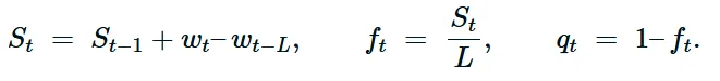 证明:在二进制模型中,根据构造 0≤nimpt≤L ,因此 0≤ft≤1 且 qt=1−ft∈[0,1] 。在分数模型中,窗口和 St 是最后 L 个质量项的总和,每一项都在 [0,1] 之间。因此,$0 \le S_t \le L ,这意味着,这意味着 f_t \in [0,1] 且 q_t \in [0,1] $ 。