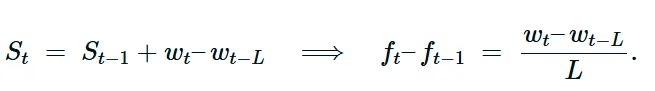 分数模型:如前所述,确切的单步变化是 ft−ft−1=Lwt−wt−L 。因此,恢复( ft 向下移动)的充分必要条件是在区间 {t1,…,t2} 上对于每个 t 都有 wt≤wt−L 。在此条件下, {ft} 在该区间上是非递增的。直观地说,每一步都用相等或更小的进入质量 wt 替换离开的质量 wt−L ,因此滑动平均值不能增加。