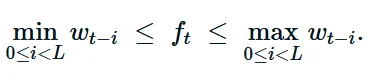区间上的单调性:若对于索引集 T 中的每一步都有 w_t \ge w_{t-L} ,则 \{f_t\}_{t \in T} 是非递减的;若对于所有 t \in T 都有 w_t \le w_{t-L} ,则是非递增的。特别是,若序列 (w_t) 在 t 上是(全局)非递减的,则对于所有 t≥L ,都有 w_t≥w_{t-L} ,因此对于所有 t≥L , f_t 是非递减的(对于非递增运行也有对称陈述)。