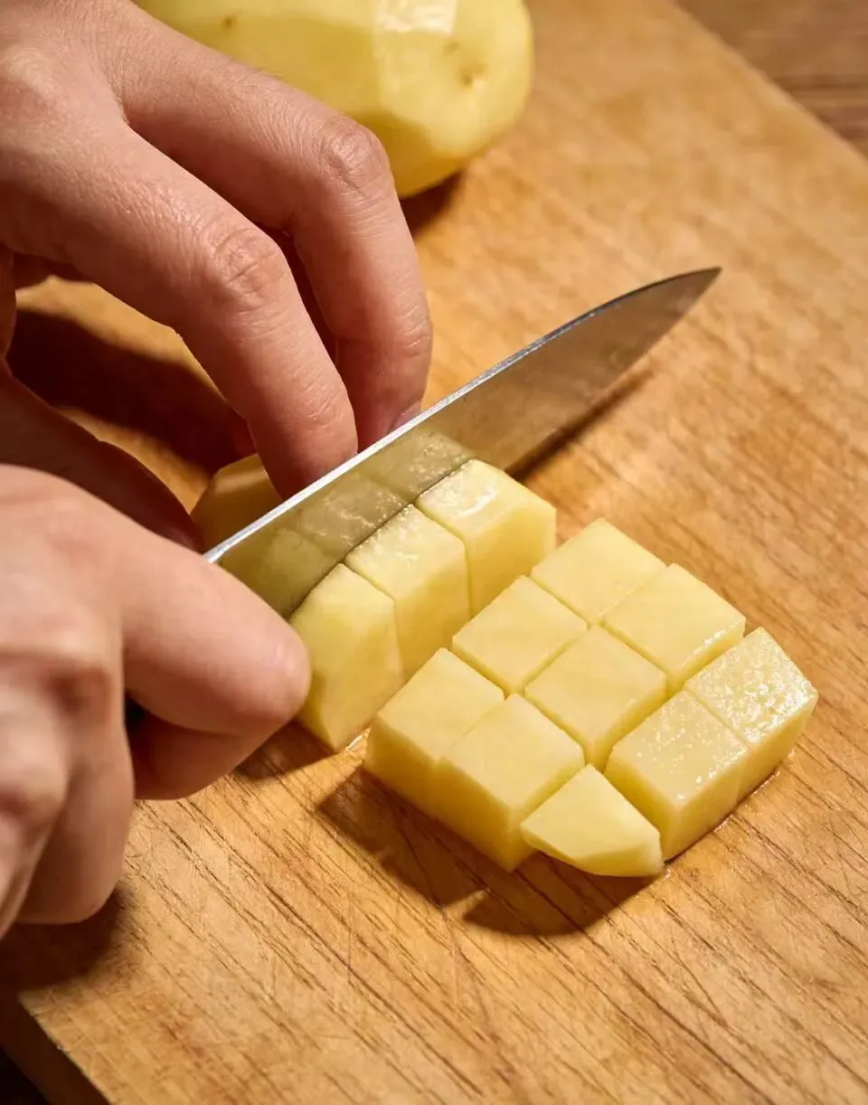 这一步的奥秘在于“焯水”。短暂的热水浴,能让土豆表面淀粉糊化,形成一层看不见的膜。这层膜,正是后来在烤箱里变身酥脆外壳的“种子”。
