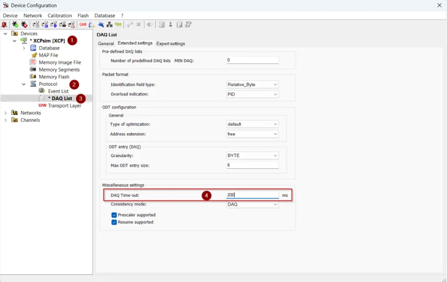 (1) 在XCP Protocol Options或Extended DAQ Settings中设置Time-out 超时时间。