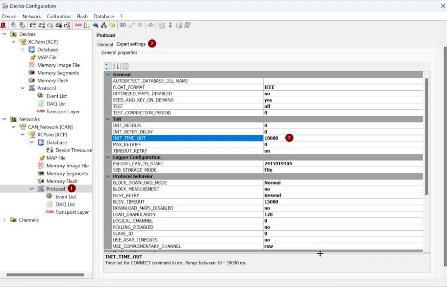 (3)在Device | Protocol | Expert Settings中可配置INIT_TIME_OUT,该参数定义了初次尝试与ECU连接(第一条CONNECT 命令)的超时时间。