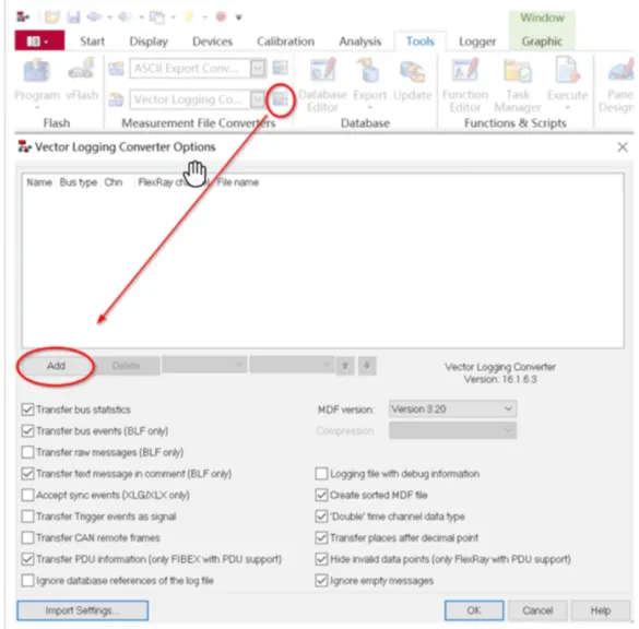 转换器包括:Vector Logging Converter,ASCII Import Converter,ATFX Import Converter,GPS Import Converter和TDMS Import Converter。