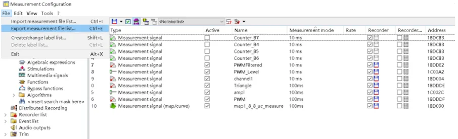 为了实现不同工况或实验条件下测量信号列表和周期的切换,或者实现其它 CANape 工程复用当前工程的测量列表等需求,可通过导入/导出测量列表的方式来实现。