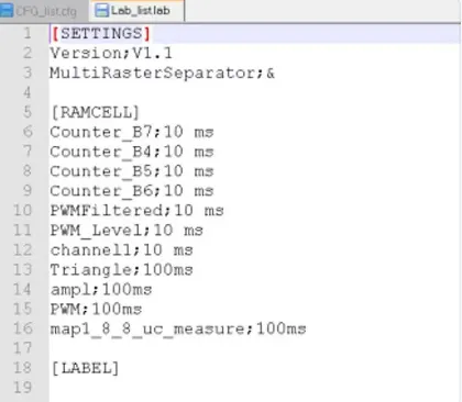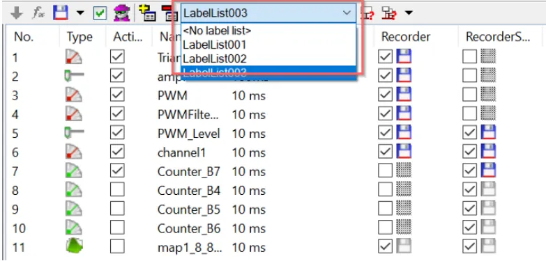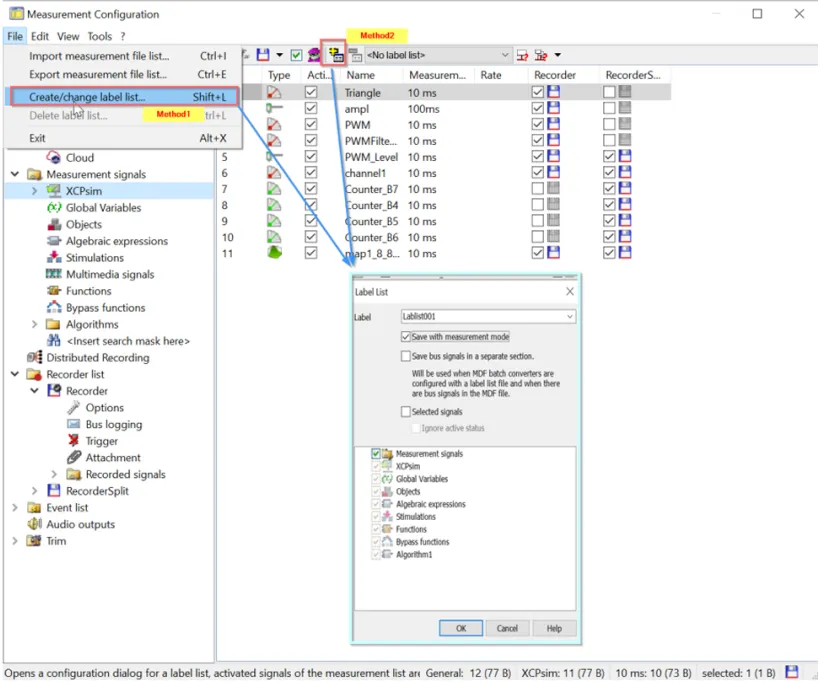 可以使用Label List 快速切换测量列表,方法如下图。File | Create | Change Label List,在弹窗中配置列表名称和属性即可,生成的测量列表会默认保存在CANape工程路径下。