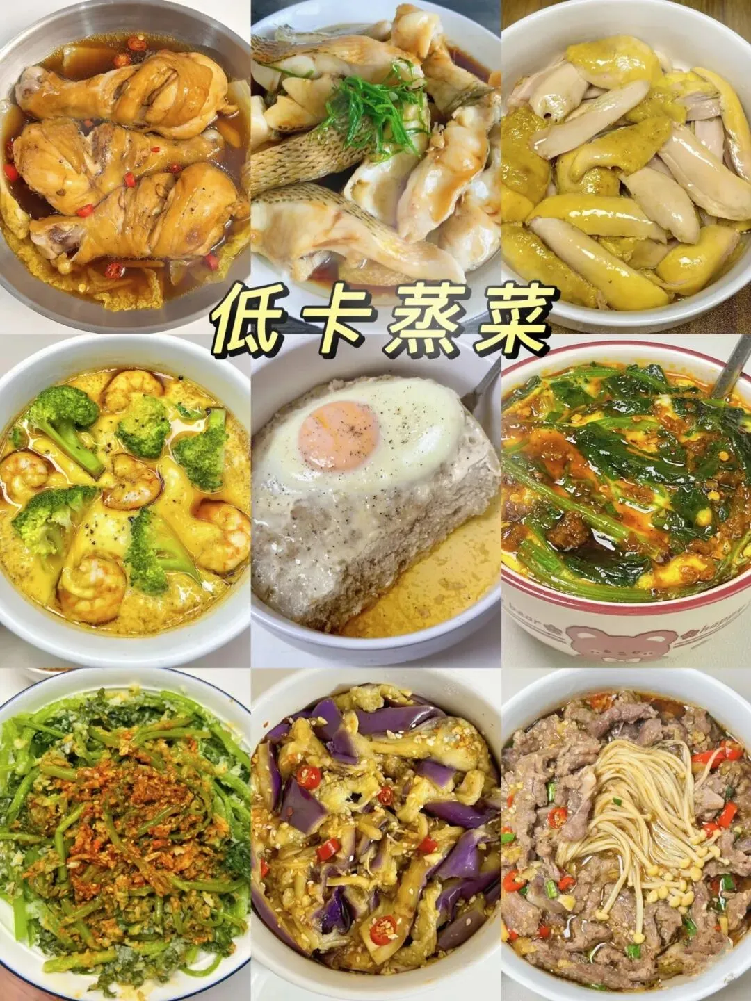 无油蒸鸡腿、蒸鲈鱼、盐焗鸡、西兰花虾仁蒸蛋、鸡蛋蒸肉饼、香辣蒸菠菜、蒸茼蒿、蒸茄子、金针菇蒸牛肉。