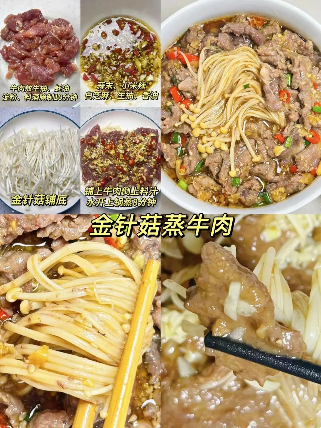 有河南特色蒸茼蒿、下饭神器蒸茄子、还有减脂人超爱的金针菇蒸牛肉。