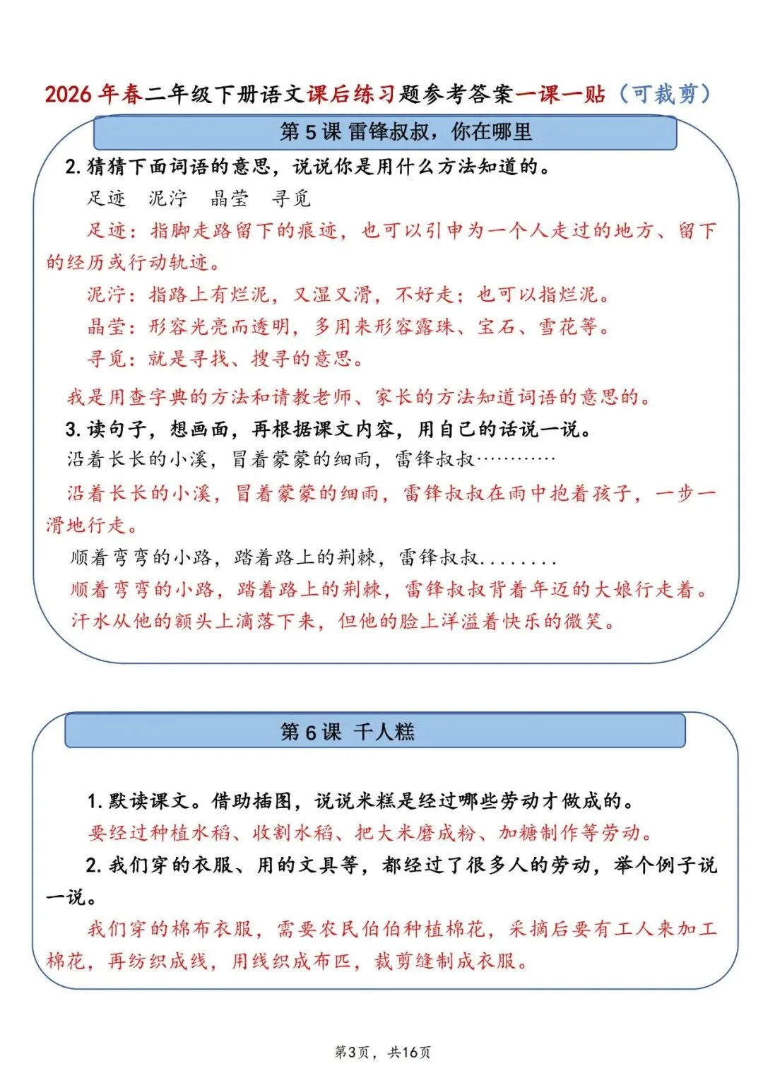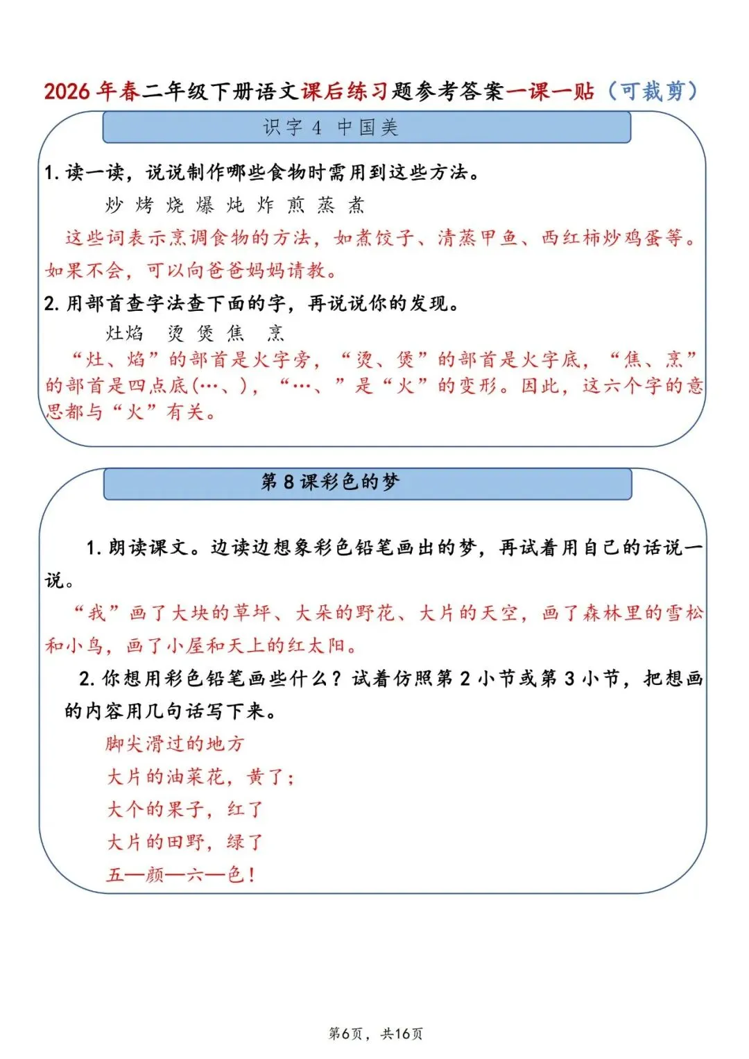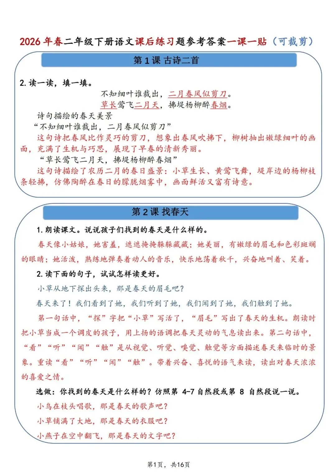 26春二年级下册语文课后练习题参考答案一课一贴电子版16页。