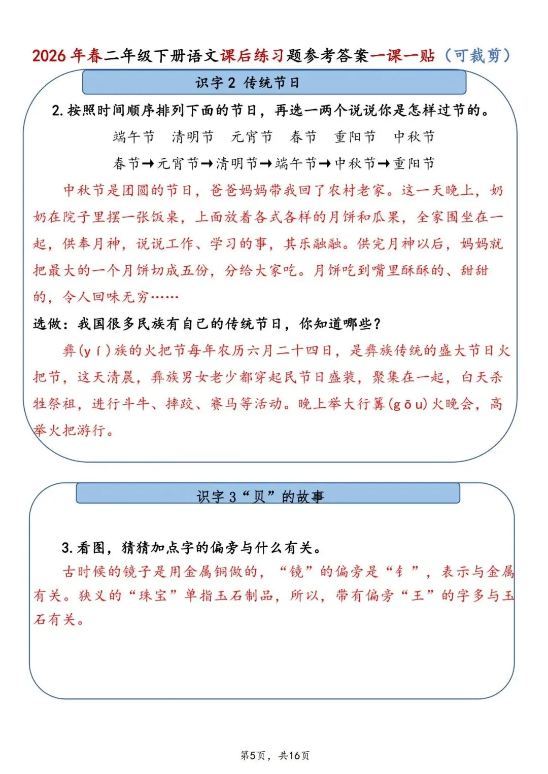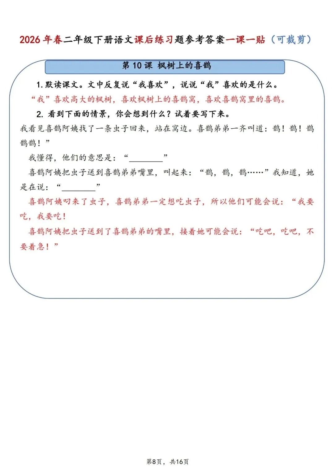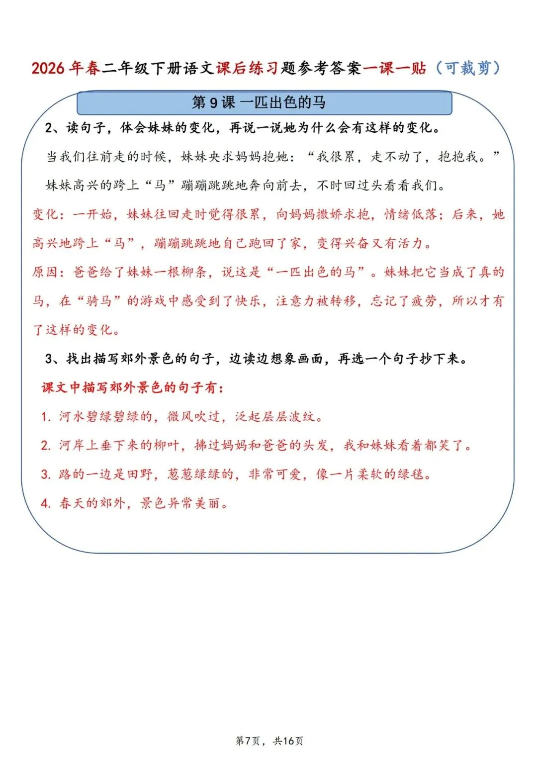 26春二年级下册语文课后练习题参考答案一课一贴电子版16页。