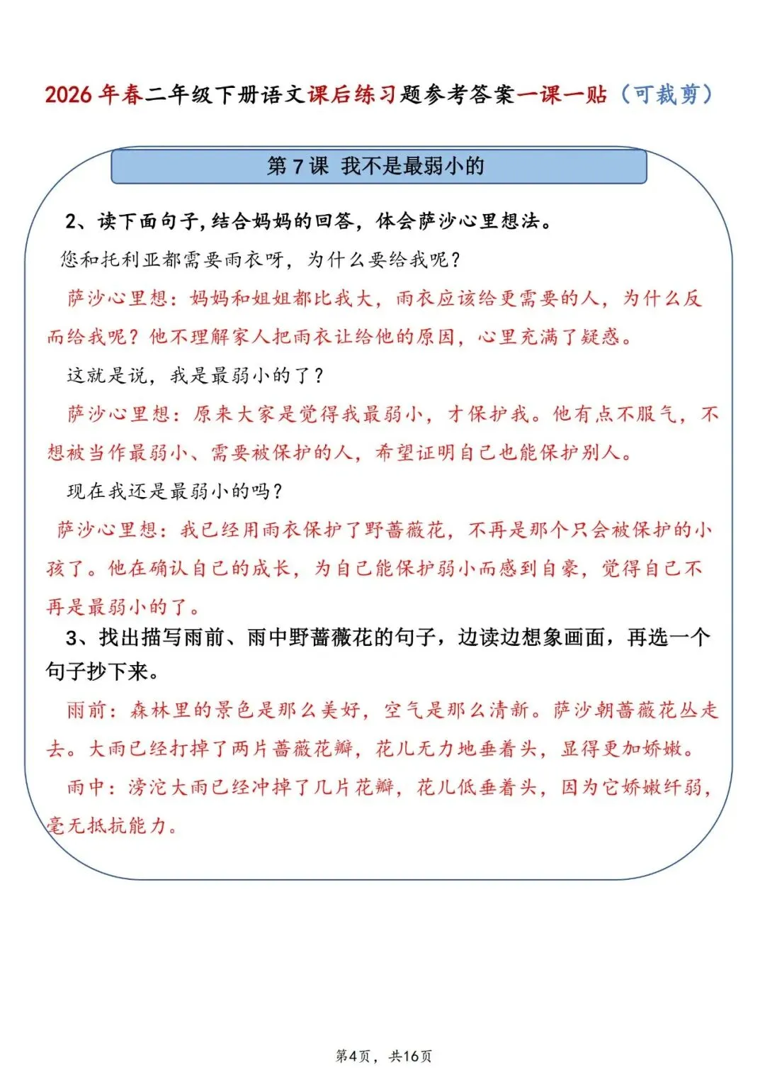 预习必备!2026春二年级下册语文课后练习题参考答案一课一贴可打印电子版16页
