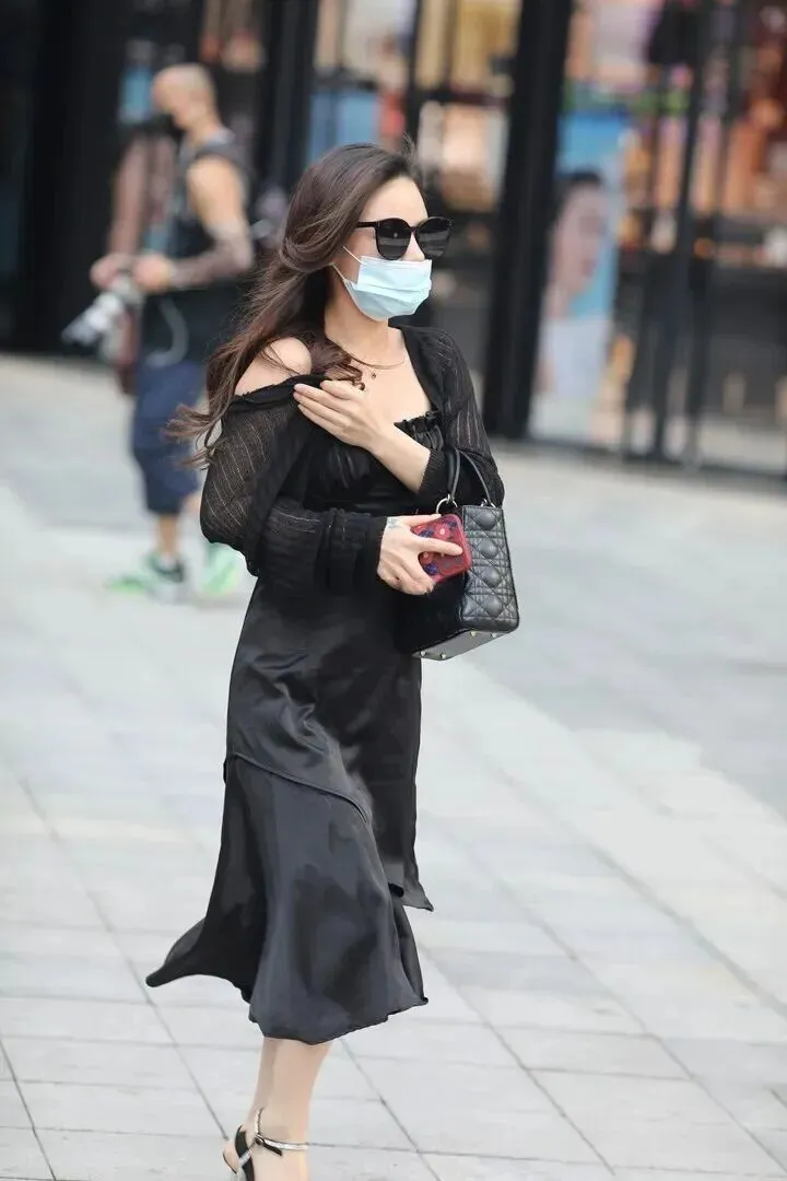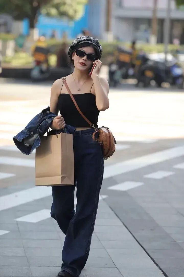 复古港风的经典元素依然有其魅力,黑色针织吊带上身穿得很有视觉冲击力,搭配深蓝色高腰牛仔裤就形成温柔中带着点帅气的感觉。黑白格纹贝雷帽加上红棕色口红就非常有复古的风格感,棕黄色的老花包增添奢华的感觉。这身衣服就像是把人们带回了老电影的浪漫街头。
