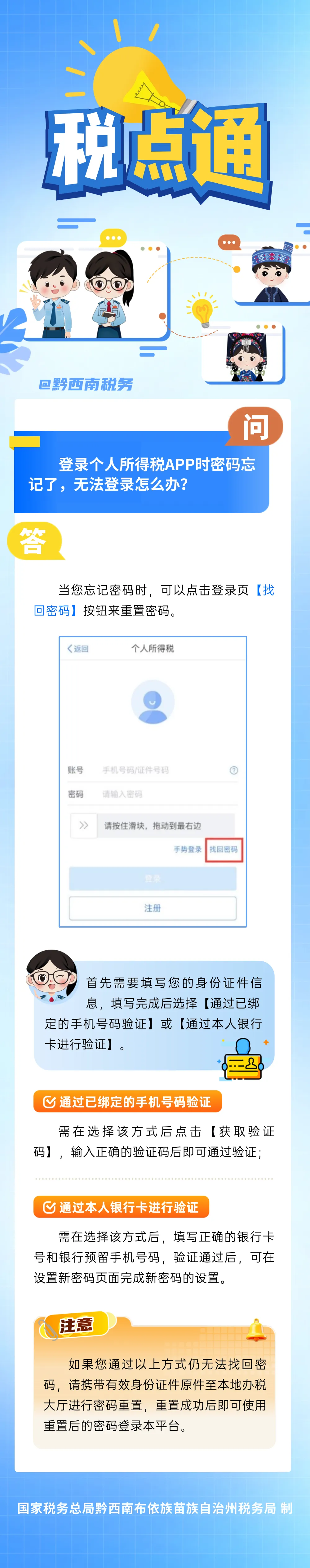 税点通丨登录个人所得税APP时密码忘记了,无法登录怎么办? 往期推荐 税点通丨什么时候办理2025年度个人所得税综合所得汇算清缴? 税点通丨个体工商户同时有工资薪金所得,经营所得汇算时还能扣费用6万元、专项扣除、专项附加扣除吗? 税点通丨个体工商户在生产经营时无法区分家庭支出和生产经营支出,这一部分的支出能在收入中扣减吗? 来源: 国家税务总局黔西南布依族苗族自治州税务局 审核: 黔西南州税务局个人所得税科 编发: 黔西南州税务局纳税服务中心(税收宣传中心)