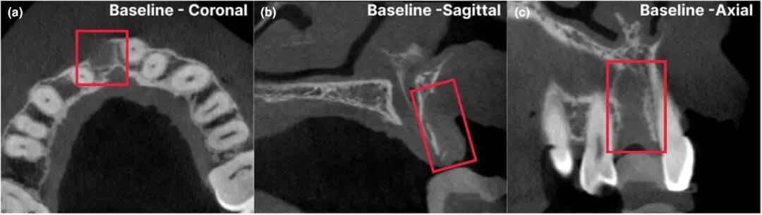 图2 11牙(右上中切牙)拔除后骨质破坏严重(图中红框所示区域)
