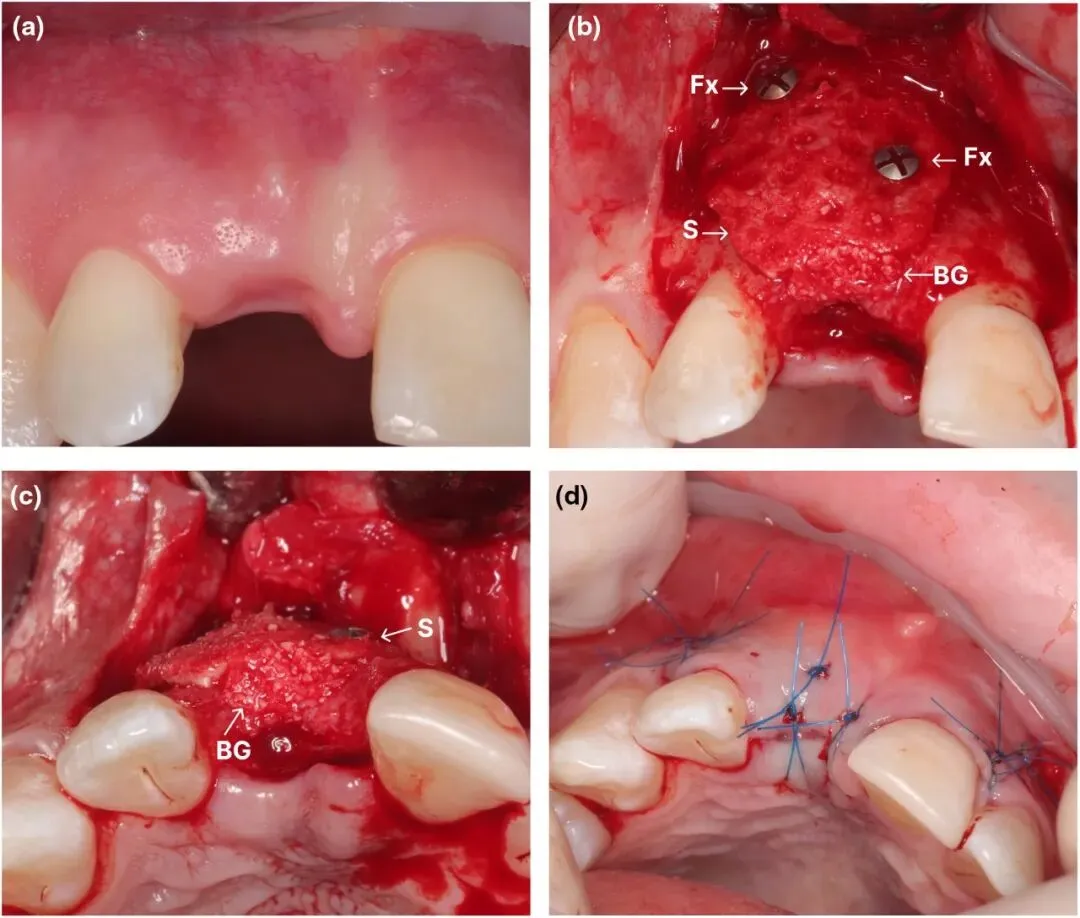 图4 支架引导骨再生(SGBR)治疗上颌骨水平缺损的阶段[(a)术前口内情况。(b)、(c)使用钛制自攻螺钉结合iPRF、ABBM和AB的混合物进行支架放置和固定。(d)引导骨再生(GBR)后的伤口闭合。S = PCL支架,BG = iPRF/ABBM/AB混合物,Fx = 钛制自攻螺钉]二期(术后6个月):CBCT 复查骨再生良好,支架部分降解,植入种植体(初期稳定性佳);愈合后安装牙冠完成修复。